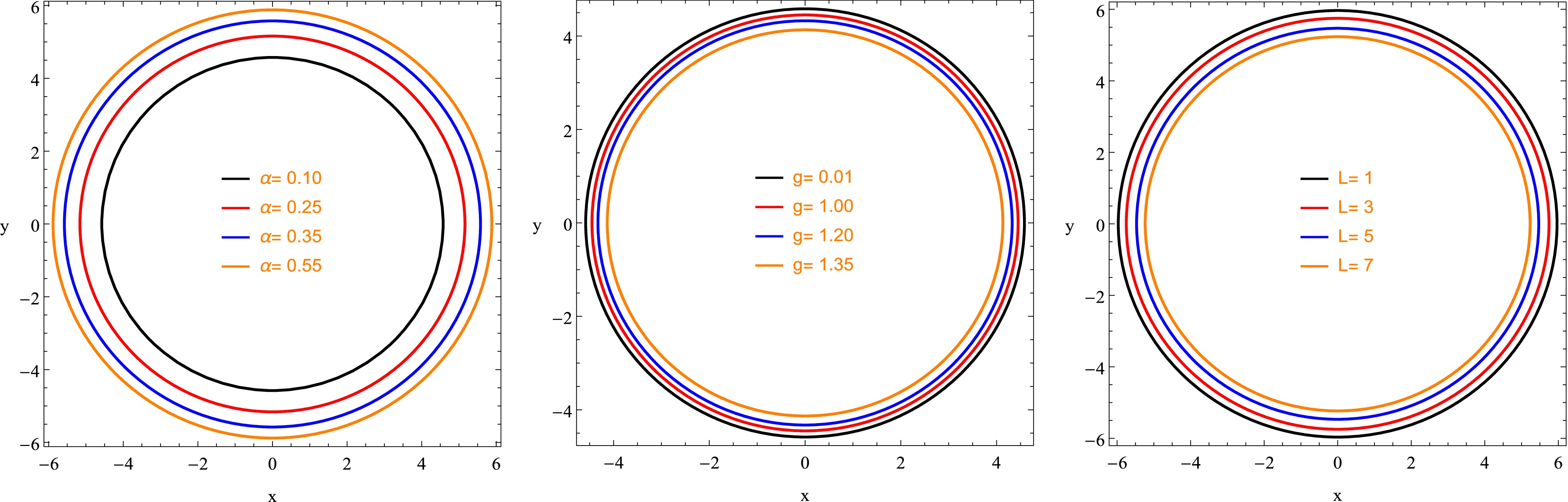 $ R_{sh} $ can be represented by the two celestial coordinates X and Y, where$ R_{sh} = \sqrt{X^2 + Y^2} $ for the observer [161–162]. It is noted that the shadow radius behaves very similarly to the$ r_{\mathrm{ISCO}} $ radius. The shadow radius$ R_{sh} $ along α decreases with an increase in g and increases with an increase in L;$ R_{sh} $ along g increases with an increase in$ \alpha\;\&\;L $ ; and$ R_{sh} $ along L decreases with an increase in g and increases with an increase in α. -