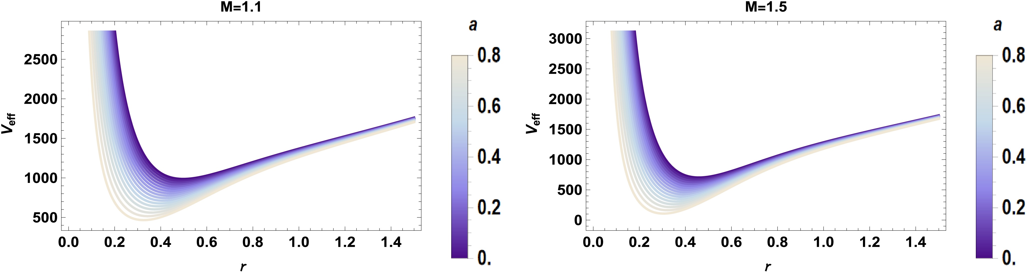$ V\mathrm{_{\mathrm{eff}}}(r) $ and$ {\cal{L}} $ represent notations used for the effective potential defining the motion of the test particle along the radius and angular momentum, respectively. The motion of neutral particles around the BH may be determined by setting$ \dot{r} = 0 $ and$ \ddot{r} = 0 $ .Next, we examine the