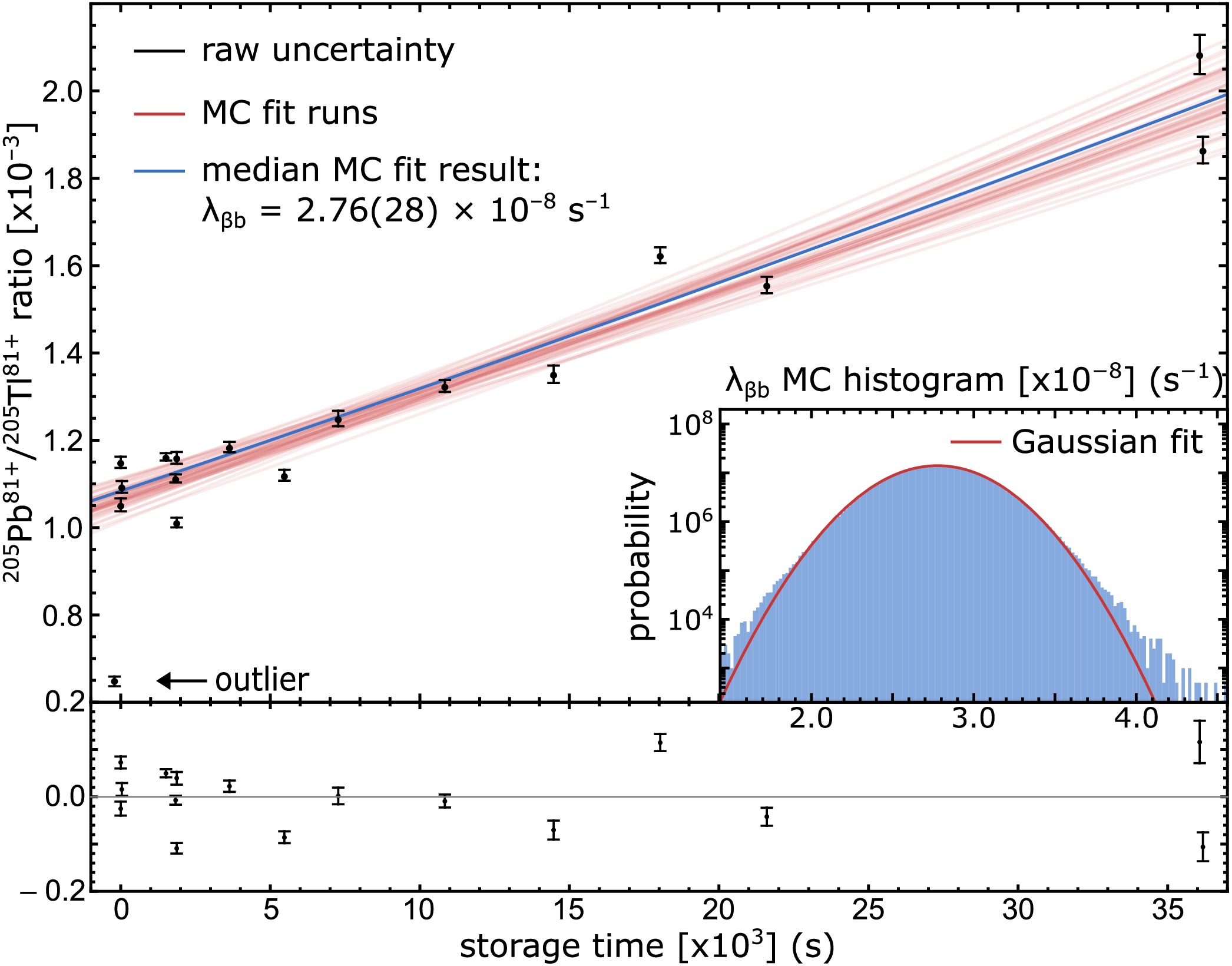 $ \pm1\sigma $ intervals of the MC simulation for that ratio. This figure also shows the best fit results from 100 sample MC runs, with the inset showing the histogram of the MC best fit results of the$ \beta_b $ decay rate.Figure 2. (color online) 205Pb/205Tl ratios for all storage periods, including the "raw uncertainty" from the corrections, alongside a sample of 100 MC fits (red) and the median MC fit result (blue), which represents the median value of the MC histogram of the final model parameters. The residuals (lower panel) highlight that some statistical variation is missing to account for the scatter in the data. The inset shows the MC histogram for