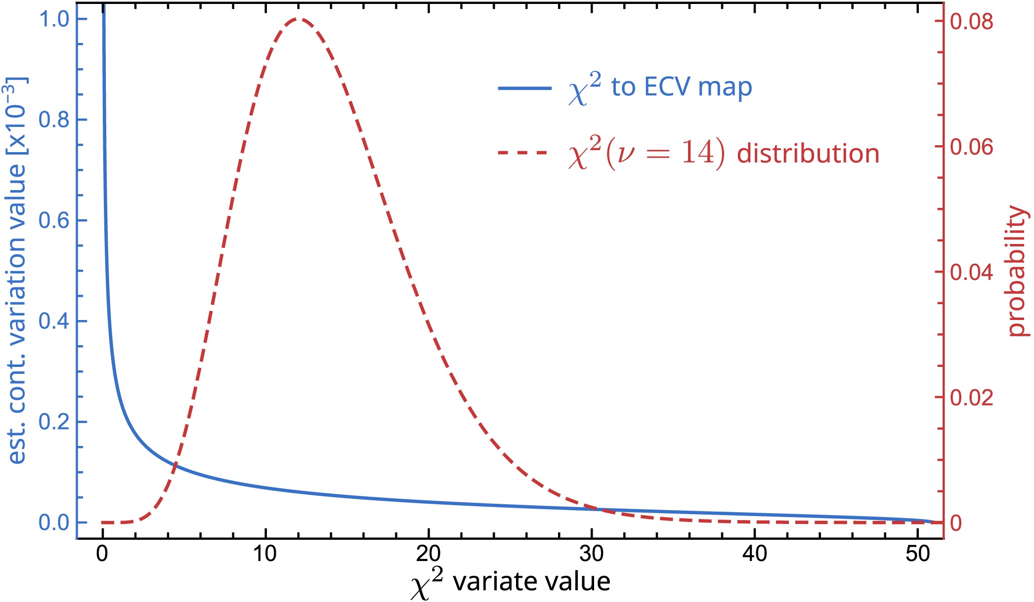 $ \chi^2 $ distribution distribution can no longer sufficiently constrain the missing uncertainty. Consider our case with$ n-k =14 $ where the 95% confidence interval of the associated$ \chi^2 $ distribution is [6.6, 23.7]. Using the Birge ratio to achieve a final$ \chi^2 $ value of 14 is not well motivated over other values in this range, which has led to criticism of the method over the years. However, this problem can be naturally solved by the Monte Carlo propagation method because for each MC run, a different target value for$ \chi^2 $ can be chosen. Specifically, we constructed a mapping between the$ \sigma_{\rm{CV}} $ value and the minimum$ \chi^2 $ value for that$ \sigma_{\rm{CV}} $ value. Using this mapping, we could then randomly sample a$ \chi^2 $ variate for that MC run and determine how much contamination variation to add to the data for that MC simulation run. This allowed us to naturally incorporate the uncertainty with which the data can constrain the missing statistical variation identified by the$ \chi^2 $ goodness of fit test, solving a key weakness of the Birge ratio through the unique framework of the Monte Carlo method. The mapping between the value of$ \chi^2 $ and$ \sigma_{\rm{CV}} $ is represented in Fig. 3 along with the$ \chi^2(\nu=14) $ probability distribution that was sampled.Figure 3. (color online) Mapping (in blue) between the
