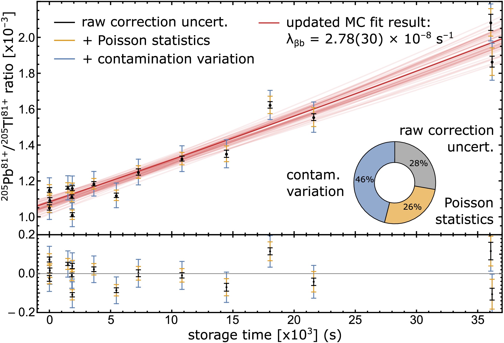 $ \beta_b $ -decay experiments [4, 5], the fully-stripped$ \beta_b $ -decay daughters were counted with particle detectors. Therefore, the number of ions was known immediately. For 205Tl81+, we chose to measure the ratio of Schottky noise power densities—proportional to the ion number according to the Schottky theorem—to avoid introducing systematic errors when calibrating the Schottky detectors. While the Schottky noise power density has its own uncertainty, it does not account for the variance introduced by the Poisson statistics. The Poisson uncertainty in the ratio$ R=N_{\rm{Pb}}/N_{\rm{Tl}} $ is just$ \sigma_R=\sqrt{R/N_{\rm{Tl}}} $ (see Appendix A for derivation). Using this expression, we can add Poisson uncertainty to each data point using the MC method in the same manner that we added the contamination variation. The results are shown in Fig. 4. As can be seen from the residuals, Poisson statistics alone are not enough to account for the missing uncertainty, although they do explain a third of the unaccounted-for variation. However, as expected, the final result from an updated MC analysis is$ \lambda_{\beta_b}= 2.78(30)\times 10^{-8}\; {\rm{s}}^{-1} $ , almost identical to the published result, indicating that the Poisson variation had been included in the contamination variation. Despite this, explicitly modeling Poisson statistics is essential when comparing the MC method with the Bayesian analysis because we are primarily interested in the behaviour of the methods when estimating the missing uncertainty.Figure 4. (color online) Updated MC method with error bars indicating the variance included for Poisson statistics and updated contamination variation. The example of 100 MC fits is again represented in red with the median fit result used to calculate the residuals. The pie chart shows the contribution of each source to the total uncertainty, highlighting that the dominant uncertainty for the experiment remains the contamination variation from the FRS.