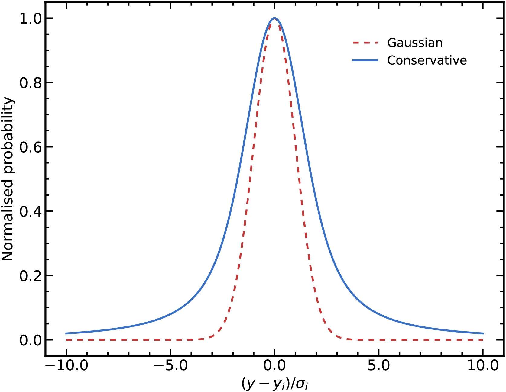 $ y_i $ and the standard deviation equal to the value of the error bar$ \sigma_i $ . The maximization of the likelihood thus corresponds to the minimization of the associated$ \chi^2 $ value. Alternatively, we considered also the approach proposed by Sivia [38], referred here to as the conservative approach, for a robust analysis. For each data point, the error bar value is instead considered as a lower bound on the real unknown uncertainty$ \sigma'_i $ that includes unevaluated systematic contributions. After marginalization over the possible values of$ \sigma'_i $ (considering a modified version of non-informative Jeffreys prior), for each datum the corresponding distribution is no longer a normal distribution but now features lateral tails decreasing as$ 1/(y - y_i)^2 $ (see Fig. 5), where$ y=y_i-f[x_i|\vec{\alpha}] $ is the theoretical expected value for the modeling function$ f[x_i|\vec{\alpha}] $ . More precisely, the final likelihood function L is now given byFigure 5. (color online) Standard Gaussian distribution compared to the distribution derived by the Bayesian conservative method for each single data point