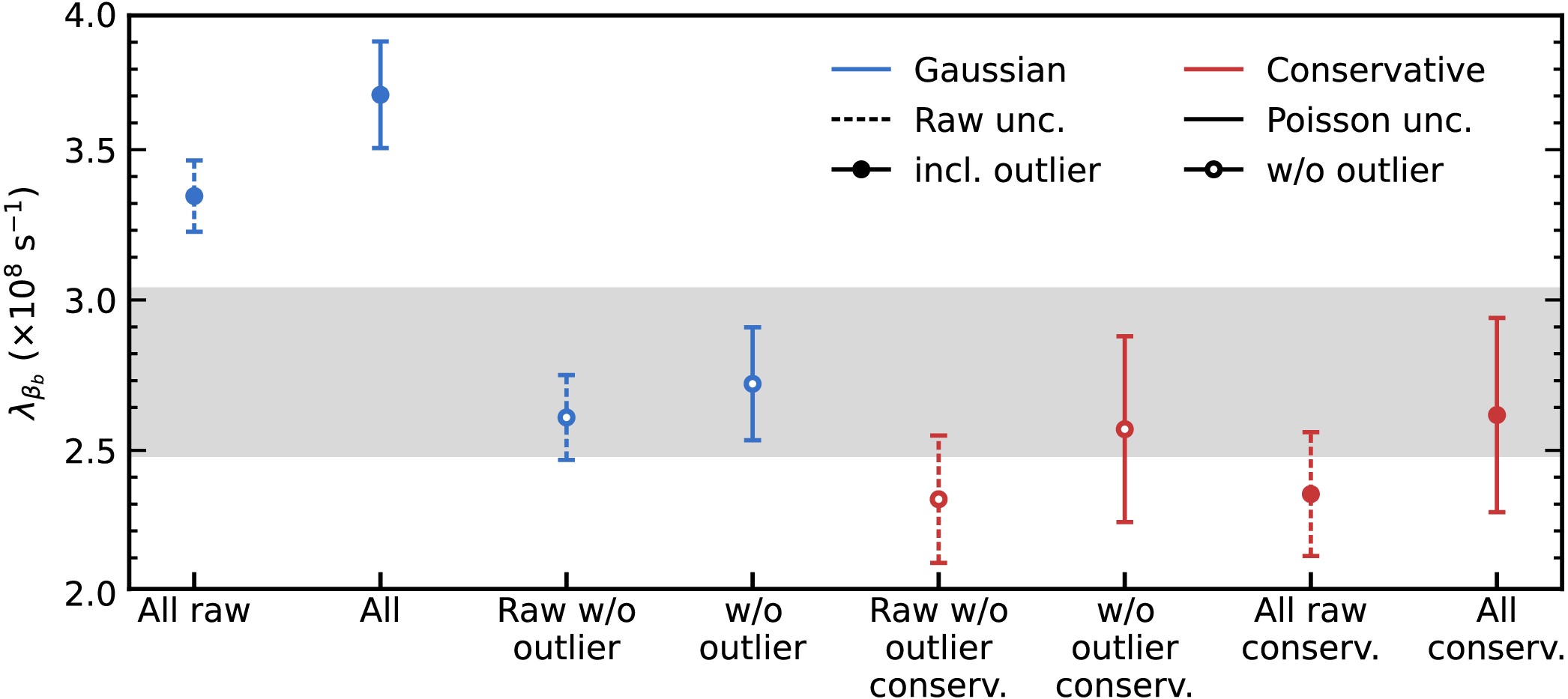 $ \chi^2 $ minimization methods. See Ref. [30] for a more extended discussion on this aspect, but applied to weighted averages. Among the different approaches, the preferable option is the one with the least working hypotheses considering the best of our possible knowledge at present. This corresponds to considering the entire set with the Poisson statistics uncertainty resulting in the parameter estimate of$ \lambda_{\beta_b}= 2.62(32)\times 10^{-8}\; {\rm{s}}^{-1} $ . -