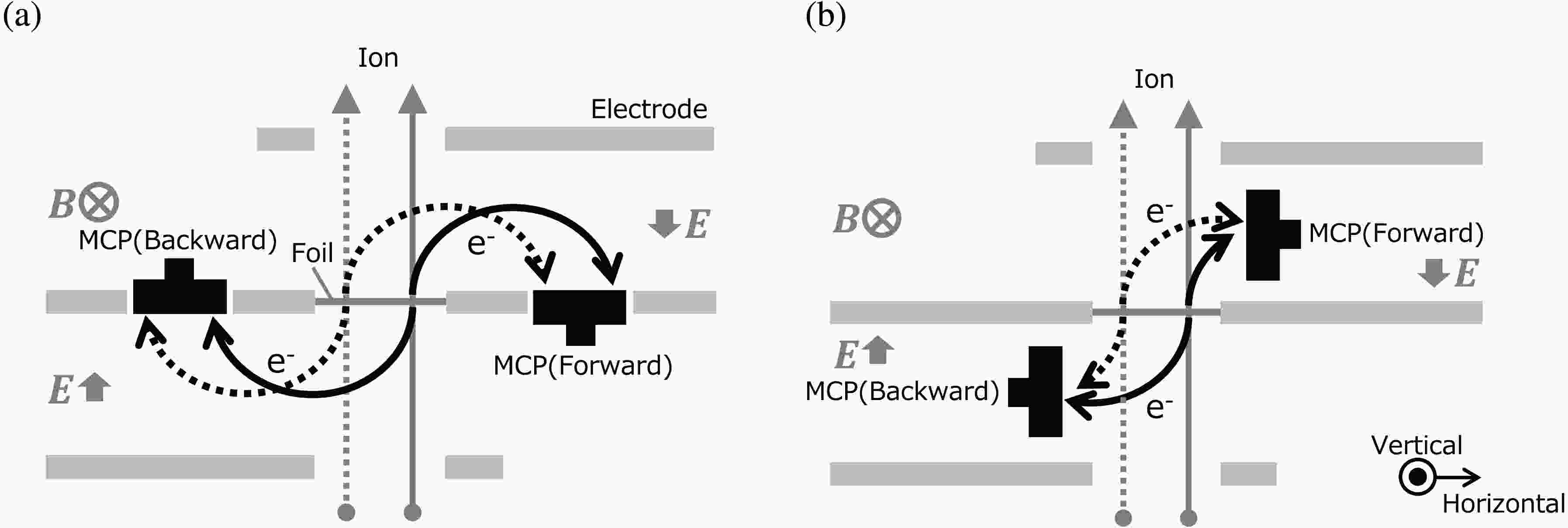 $ \rm{e^{-}} $ represent a microchannel plate detector and secondary electrons, respectively.We also developed a position-sensitive detector based on the BE-MCP, called the BE-MCP90. Figure 1 (b) shows a schematic view of the BE-MCP90. Unlike the BE-MCP, two MCP detectors of the BE-MCP90 are located in the gap of electrodes, and the effective area of the MCP is orthogonal to the electrodes. Through this arrangement, a difference in the transport time of electrons emitted forward and backward from the foil is sensitive to the horizontal position of the ions passing through the foil. In a previous study, this position sensitivity of the BE-MCP90 was experimentally confirmed [4]. In the present study, we enlarged the vertical acceptance by using large MCP detectors compared to those of the prototype.