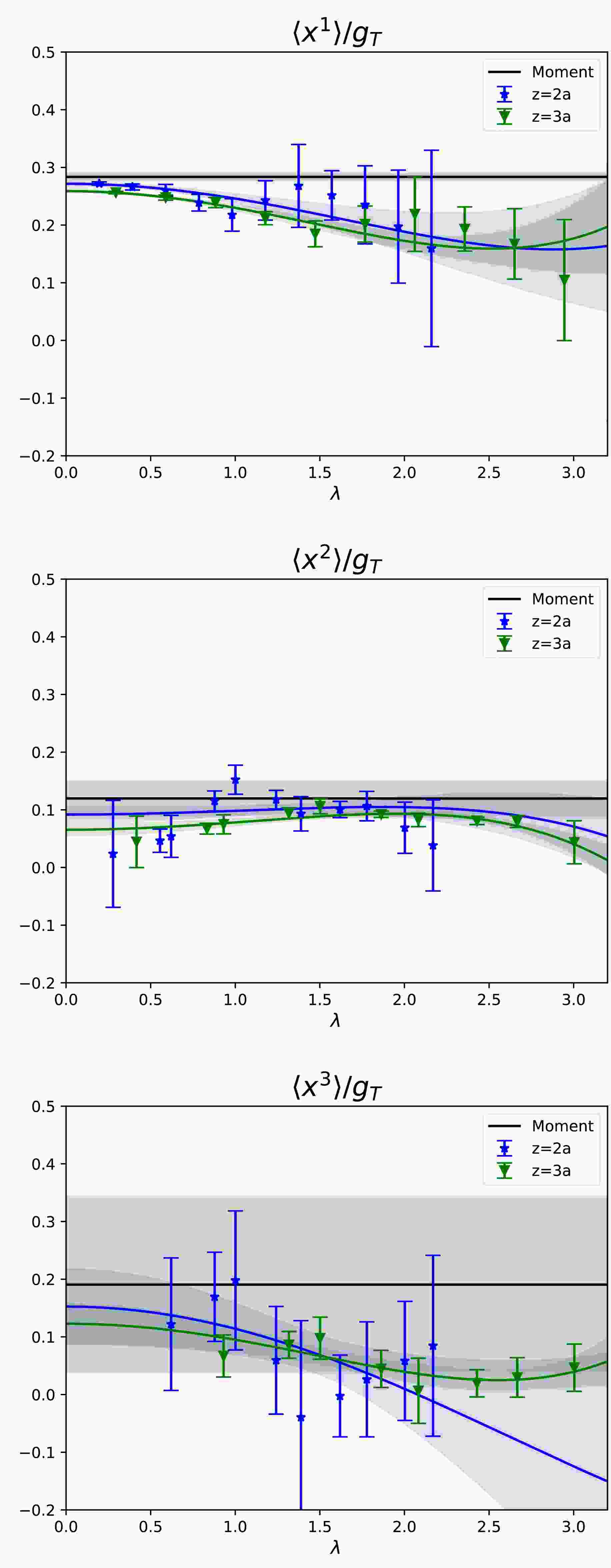 $ \langle x^{2}\rangle/g_{T} $ as an example, we start from the following formula based on OPE:$ \begin{aligned}[b] \frac{-2}{z^2C^{(2)}}\frac{{\rm d} {\rm Re}\tilde{h}_R}{{\rm d}\zeta} =\;& \frac{\langle x^2 \rangle}{g_T}(\mu) +\lambda^2\frac{C^{(4)}}{C^{(2)}}b(\mu)+\lambda^4\frac{C^{(6)}}{C^{(2)}}c(\mu) \\ & +z^2\Lambda_{\text{QCD}}^2\frac{d(\mu)}{C^{(2)}}+z^2\Lambda_{\text{QCD}}^2\lambda^2\frac{e(\mu)}{C^{(2)}}, \end{aligned} $
