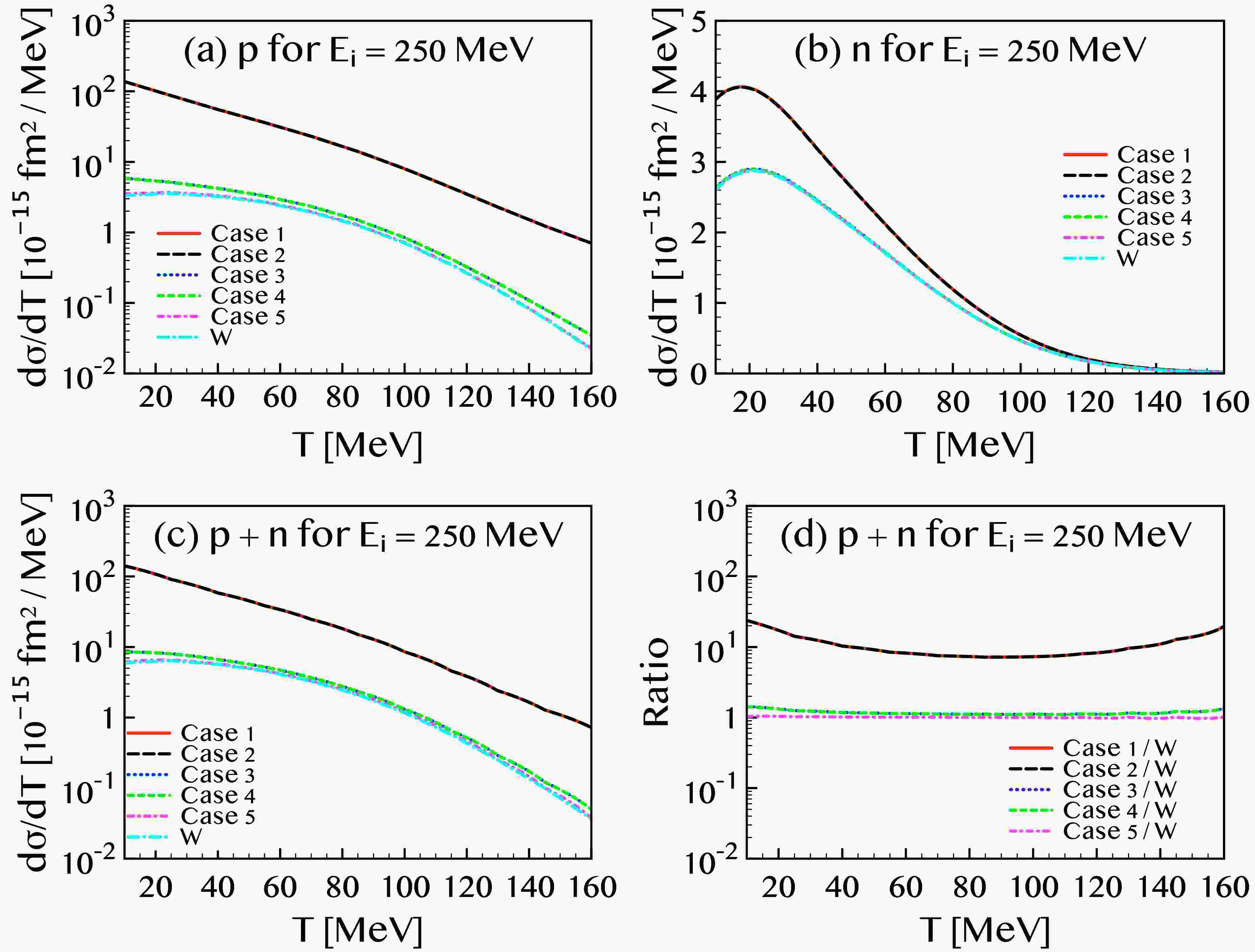 Figure 1.  (color online) Differential cross sections for the $ (\nu, \nu') $ NC reaction on a 12C target as functions of the kinetic energy T of the outgoing nucleon, calculated for an incident neutrino energy of $ E_i = 250 $ MeV. The solid (red), long-dashed (black), dotted (blue), dashed (green), and dot-dashed (magenta) curves correspond to cases 1 to 5, respectively. The dot-long-dashed (cyan) curves labeled as "W" represent results obtained without including the EM properties of the neutrino. Panels (a), (b), and (c) show the proton-only, neutron-only, and total (proton + neutron) contributions, respectively. Panel (d) displays the cross sections in panel (c) divided by the values without neutrino EM properties.