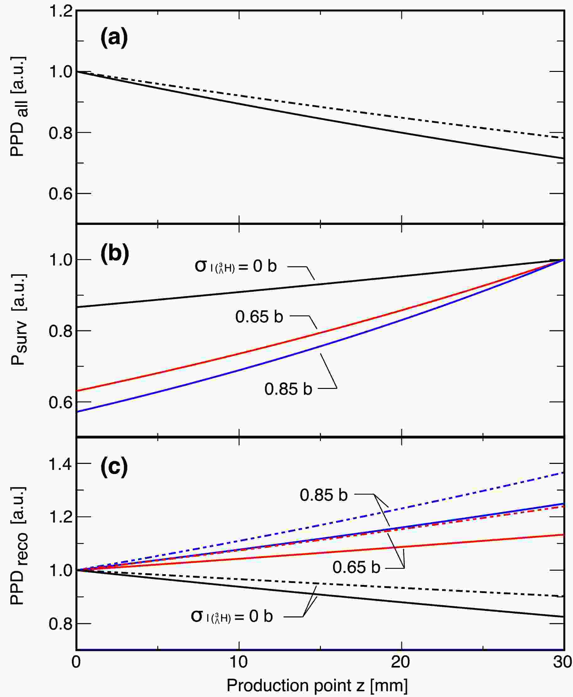 $ {\rm{PPD}}_{\rm{reco}}(z) $ is given as$ \begin{aligned}[b] {\rm{PPD}}_{\rm{reco}}(z) &\propto {\rm{PPD}}_{\rm{all}}(z) \cdot P_{{\rm{surv}}}(z) \\ &\propto e^{\left(n\sigma_{I(^{3}_{\Lambda}{\rm{H}})}+\frac{1}{\gamma\beta c \tau} - n\sigma_{I(^6{\rm{Li}})} \right)z}. \end{aligned} $