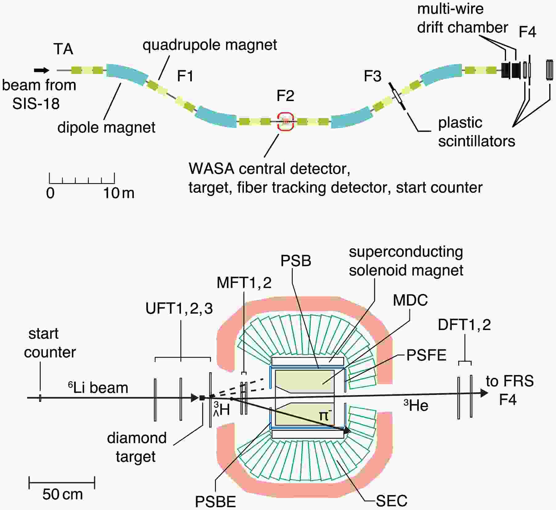 $ \pi^- $ and 3He from hypertriton) are measured to obtain the invariant-mass and decay vertex distributions. The F2-F4 section of the FRS is operated as a high-resolution spectrometer to analyze the momentum of the forward residue (e.g., 3He), whereas the$ \pi^{-} $ is measured with the WASA and additional detectors in F2 with a large solid angle. The lower panel of Fig. 2 shows a detailed configuration at F2 [44] and a typical event topology. The target is placed at the entrance of the WASA detector, which consists of a superconducting solenoid magnet [45], a mini drift chamber (MDC) [46], a plastic scintillator barrel (PSB) and its end-caps (PSFE, PSBE) [47], and an electromagnetic calorimeter [48]. In addition, a compact start timing counter [49] and sets of tracking detectors based on scintillating fibers with a diameter of 0.5 mm (UFT1–3, MFT1–2, DFT1–2) are installed for the hypernuclear experiment. The upstream detectors UFT1 and UFT2 measure the trajectory of the primary 6Li beam, and the downstream ones DFT1 and DFT2 are used for the forward heavy residue. The track of the decay$ \pi^{-} $ is reconstructed by UFT3, MFT1, and MFT2 in combination with MDC. Furthermore, other charged particles emitted in the primary reaction are recorded by UFT3, MFT1, and MFT2, which provide information on the production vertex position essential for the present investigation. The high-granularity of these fiber trackers fulfills the requirement for reconstructing the production point under high particle rate and multiplicity conditions.