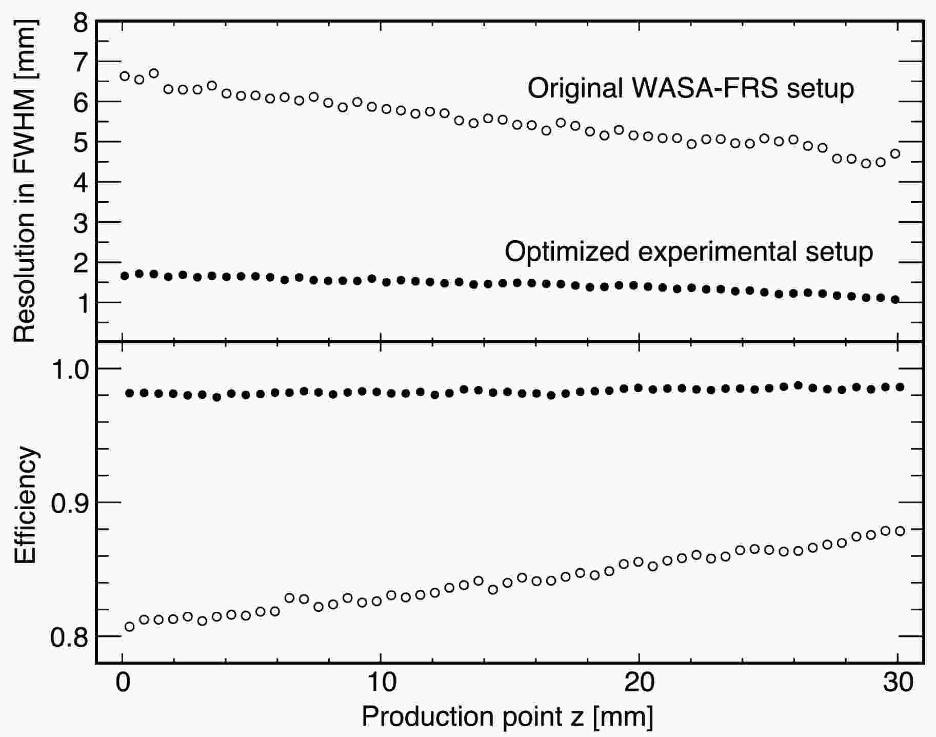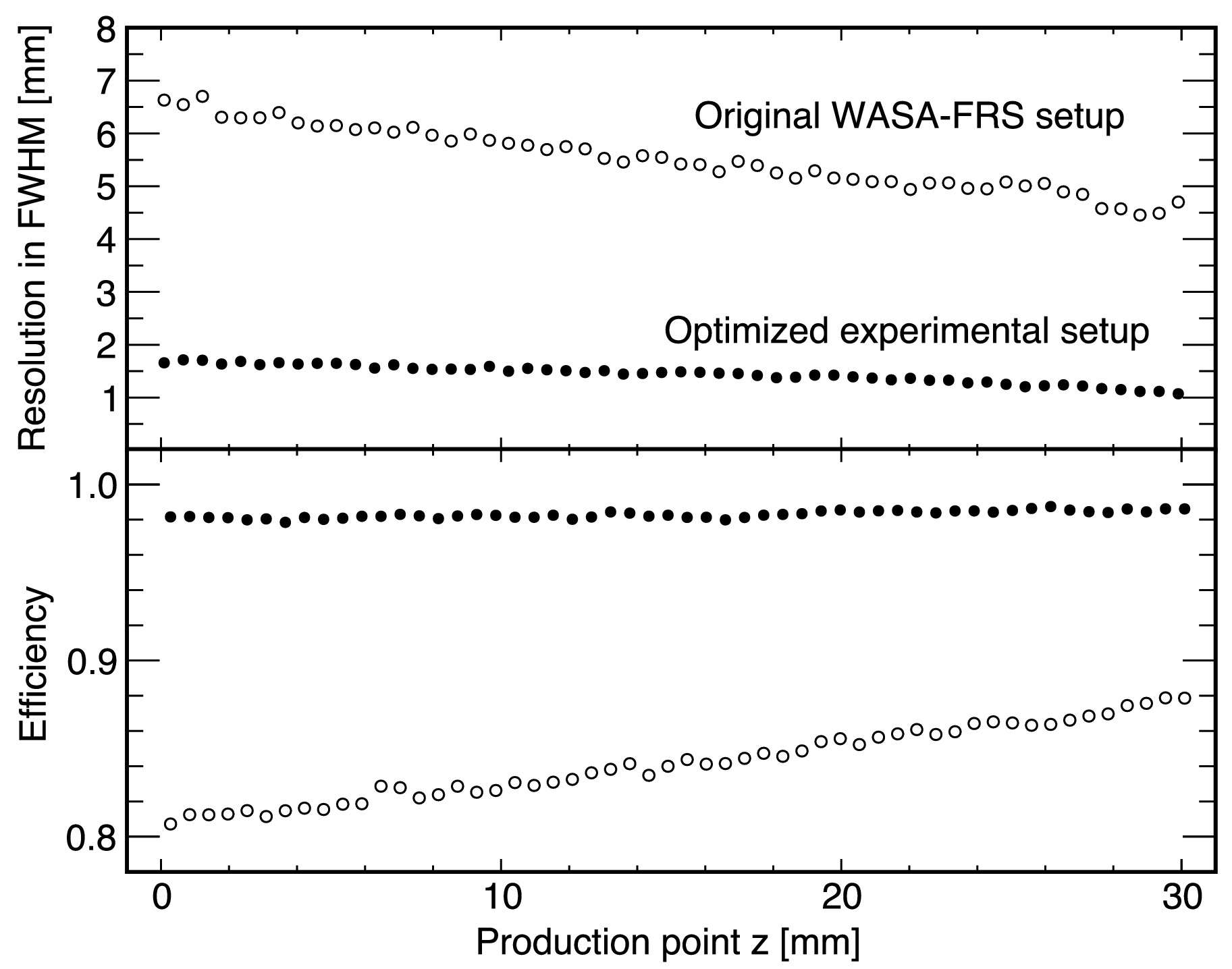 Figure 3. (Top panel) Evaluated resolution for reconstructing the production point as a function of the production point z, based on Monte Carlo simulations. (Bottom panel) Evaluated efficiency of production point reconstruction as a function of the production point z. The open and closed circles represent the results obtained with the original WASA-FRS setup (Sec. IV.A) and the optimized setup (Sec. IV.B), respectively.