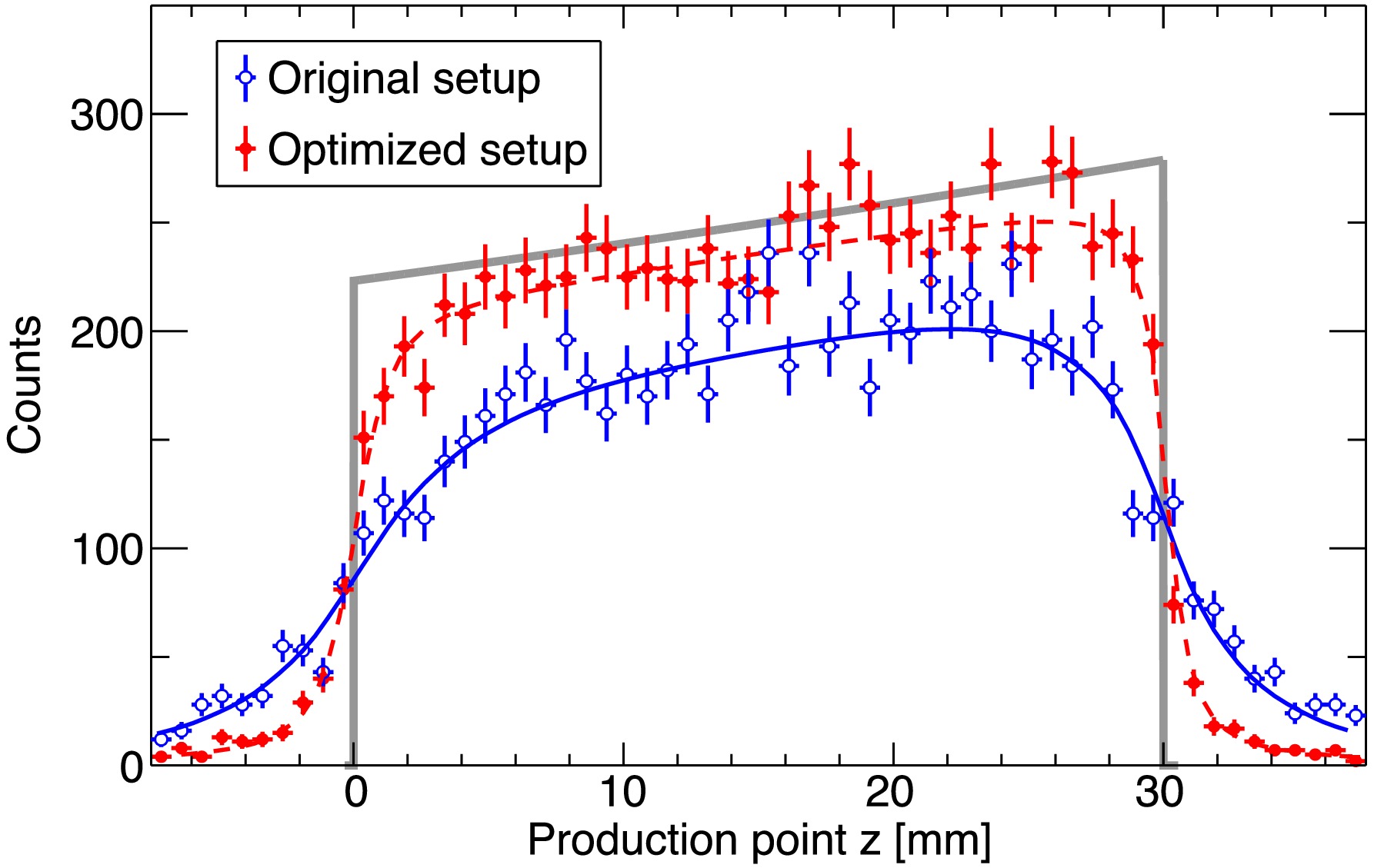 $ \leqslant z \leqslant 30 $ mm), whereas the differences represent changes in the values from$ z=0 $ mm to$ z=30 $ mm.The reconstructed production point distribution obtained with the optimized setup is shown by the red histogram in Fig. 4. The distribution exhibits clear improvements in both resolution and efficiency; the edge of the distribution becomes sharper, and the number of events with reconstructed production points within the target region is increased by 21%. The red dashed curve shows the fit results, yielding