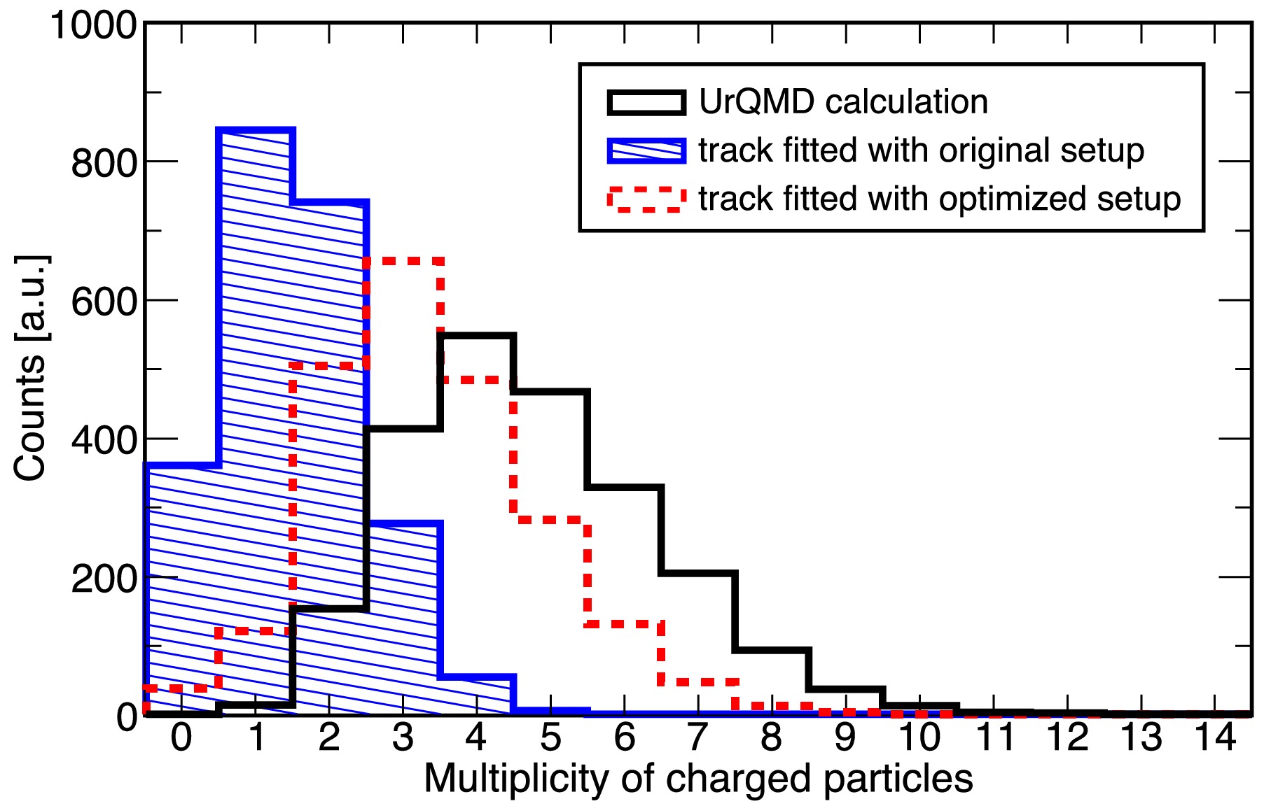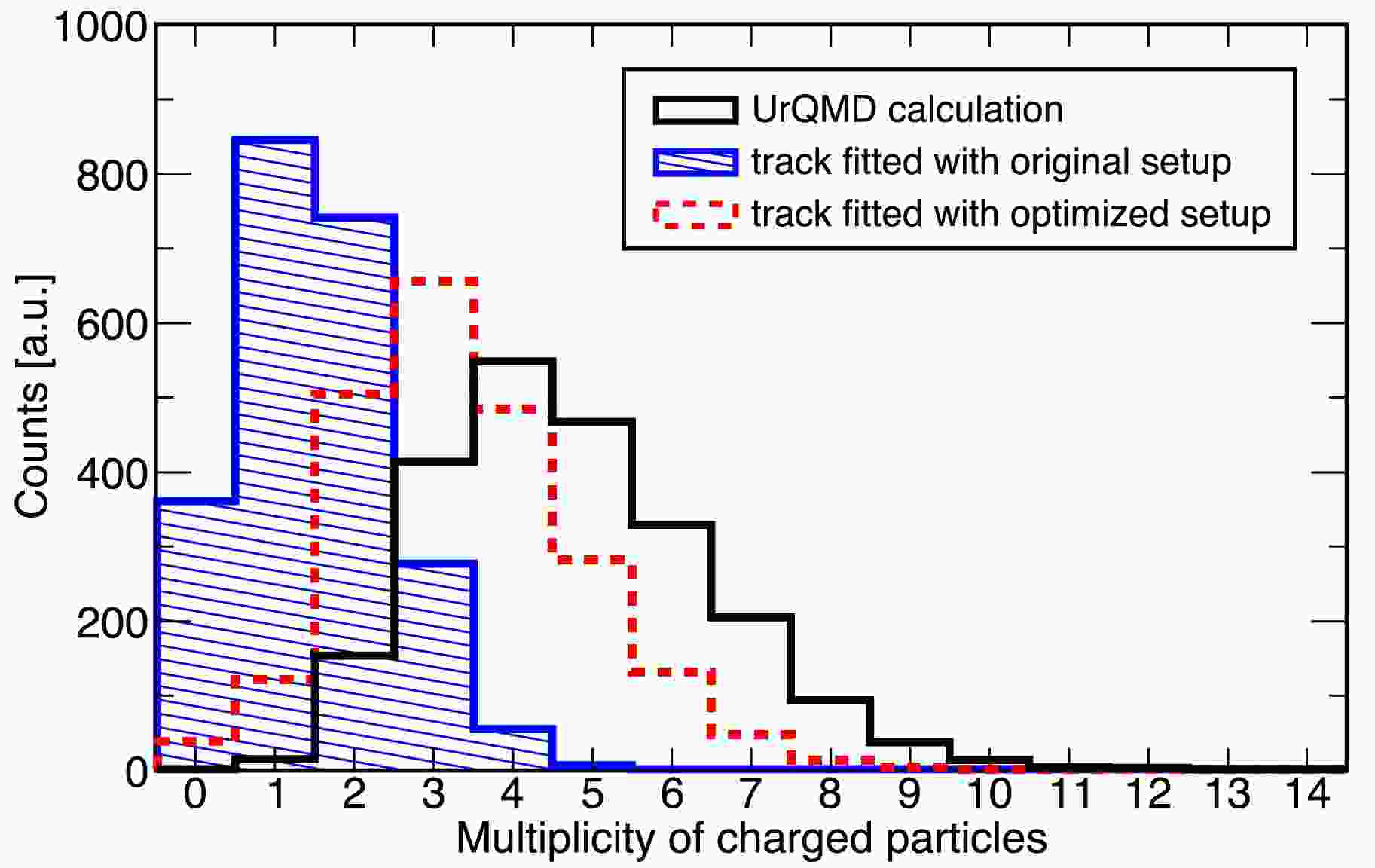 $ \pi^{\pm} $ ,$ K^{+} $ ) emitted from the primary$ {}^{6}{\rm{Li}}+^{12}{\rm{C}} $ interactions in hypertriton production events. The hypertriton and its decay products are excluded from the multiplicity count. The black histogram includes all particles generated by the UrQMD calculation. The blue and red histograms represent the multiplicity of particles reaching sufficient layers of the fiber detectors for track fitting in the original WASA-FRS setup (Sec. IV.A) and optimized setup (Sec. IV.B), respectively.The expected performance of the production point reconstruction with the modified setup is summarized in Table 1. We tested different values for the distance d between the middle points of UFT3 and UFT4 from 0 cm to 15 cm. We adopted the case with