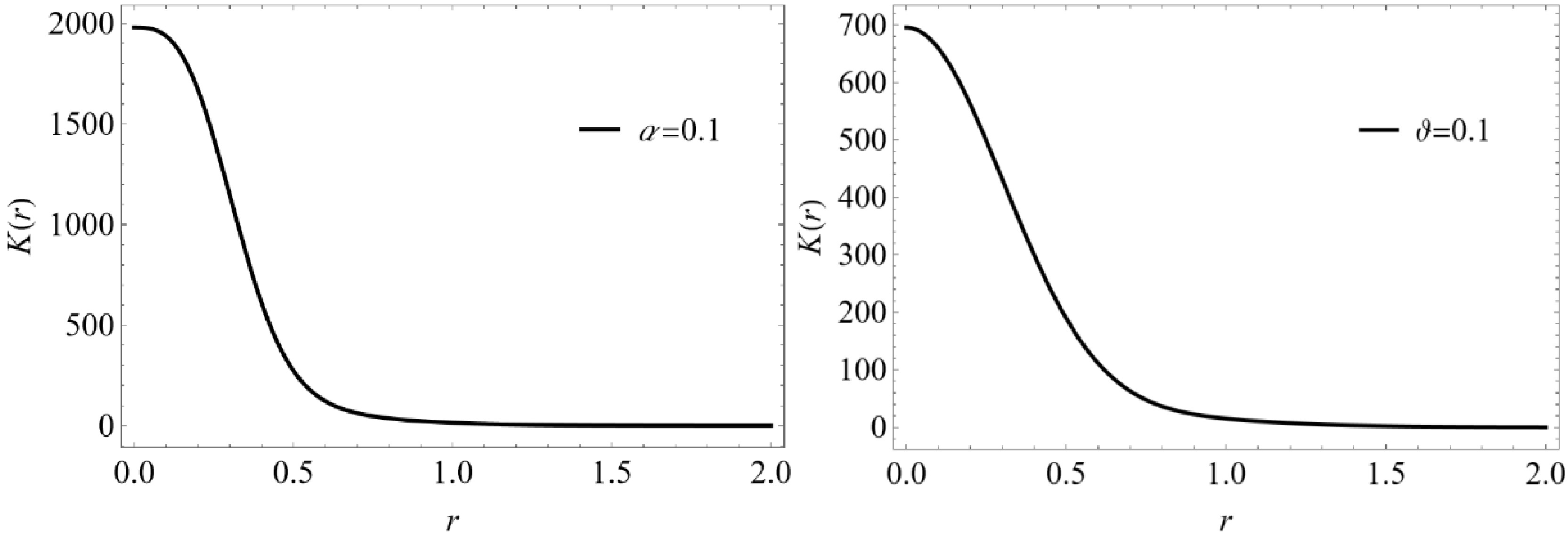 $\begin{aligned}[b] \mathcal{R} &= - \frac{{{{\rm e}^{ - \frac{{{r^2}}}{{4\vartheta }}}}M({r^2} - 8\vartheta )}}{{2\sqrt \pi {\vartheta ^{5/2}}}}, \\ {\mathcal{R}_{\mu \nu }}{\mathcal{R}^{\mu \nu }} &= \frac{{{{\rm e}^{ - \frac{{{r^2}}}{{2\vartheta }}}}{M^2}\left( {{r^4} - 8{r^2}\vartheta + 32{\vartheta ^2}} \right)}}{{8\pi {\vartheta ^5}}}, \end{aligned} $