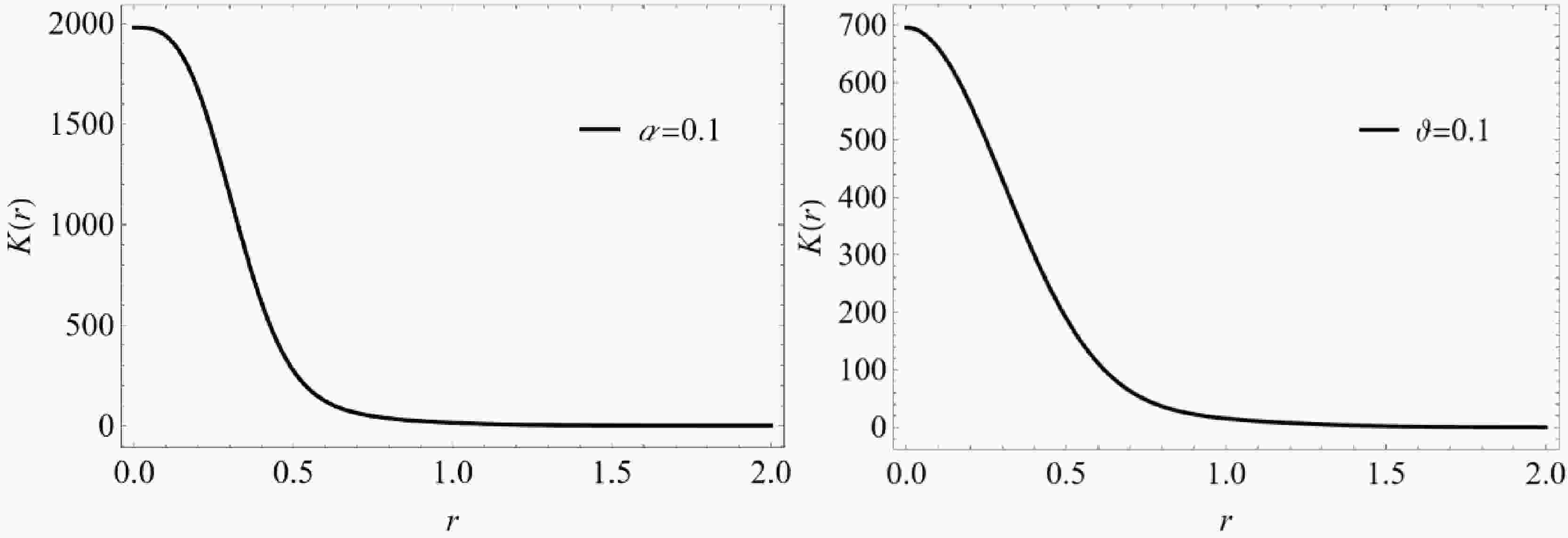 which shows that the non-commutative factor $\vartheta $ ensures the absence of a curvature singularity. Additionally, when $\vartheta \to 0$, we can similarly obtain the Kretschmann scalar for the Vaidya black hole. Figure 1 shows the relationship between the Kretschmann scalar and $ r $ for two types of dynamical black holes. It can be seen that there is no curvature singularity at the origin in both cases.
