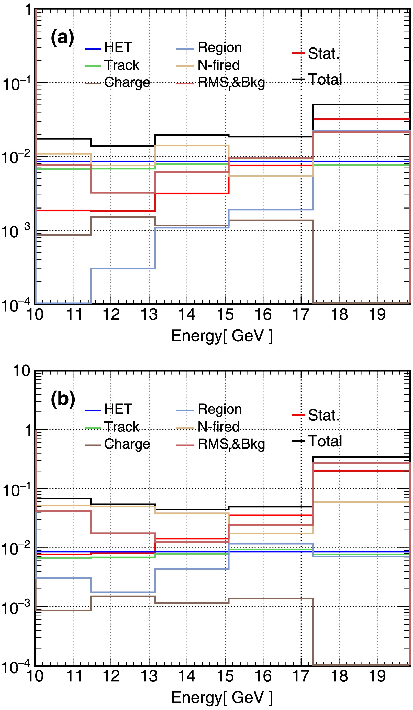 $ \ln (RMS_r/\text{mm}) $ ($ \le $ 3.0) to evaluate the efficiencies of selections for MC electrons and CR electrons, and the uncertainties are expressed by the difference between the two efficiencies. The results were$ \sim $ 0.9% for HET,$ \sim $ 0.7% for track selection, and$ \sim $ 0.1% for charge selection. Furthermore, the systematic uncertainties related to the upper limit requirement of$ \ln (RMS_l/\text{mm}) $ and$ F_{\rm last} $ are negligible. CR positrons are assumed to behave similarly as CR electrons in the detector. Therefore, we adopt the uncertainties related to the selections discussed above as the systematic uncertainties of positrons.For other selections, it is not possible to build control samples. Therefore, we changed the upper limit of the N-fired in the BGO from