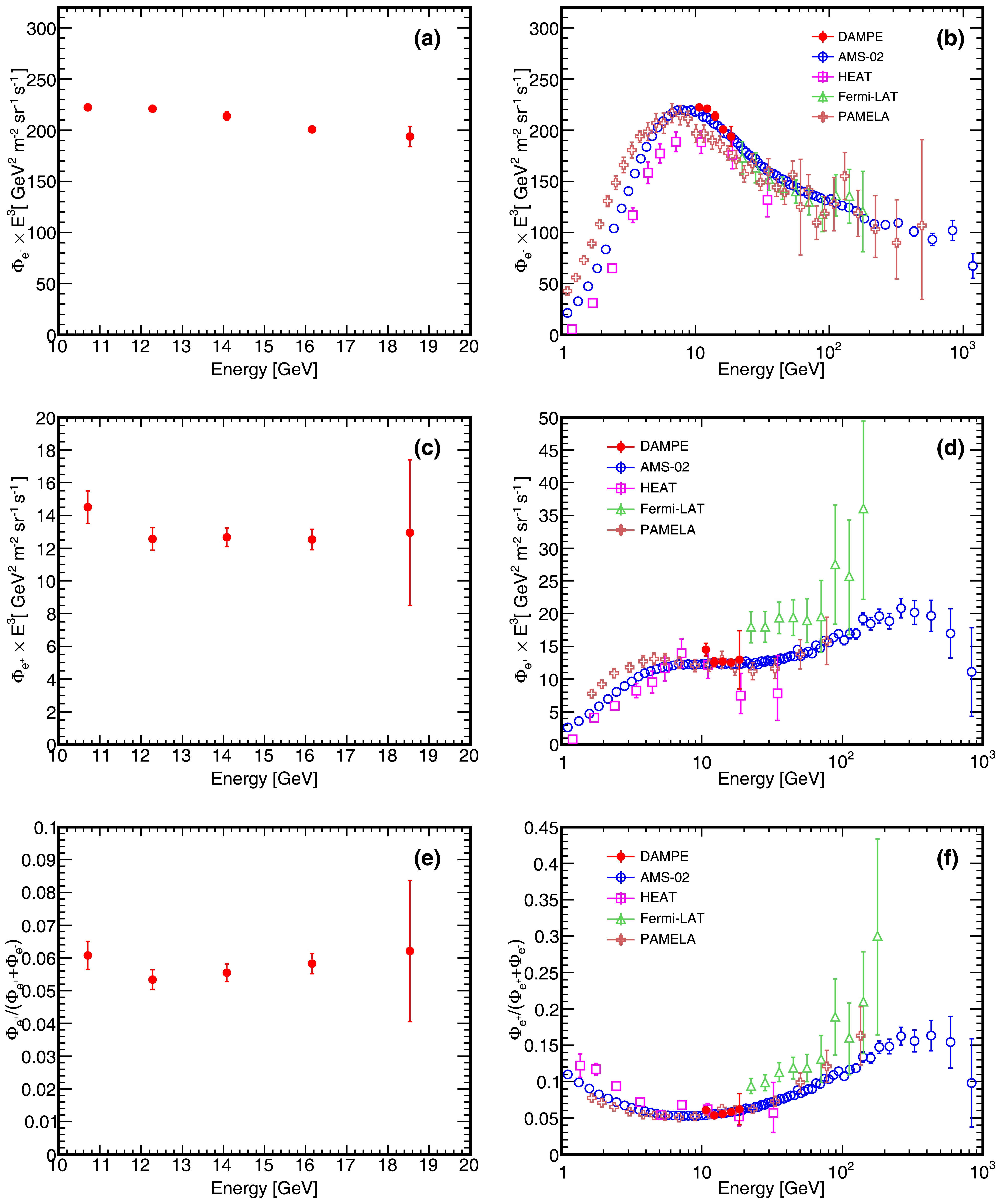 Figure 5. (color online) (a) Electron spectrum and (c) positron spectrum of DAMPE multiplied by