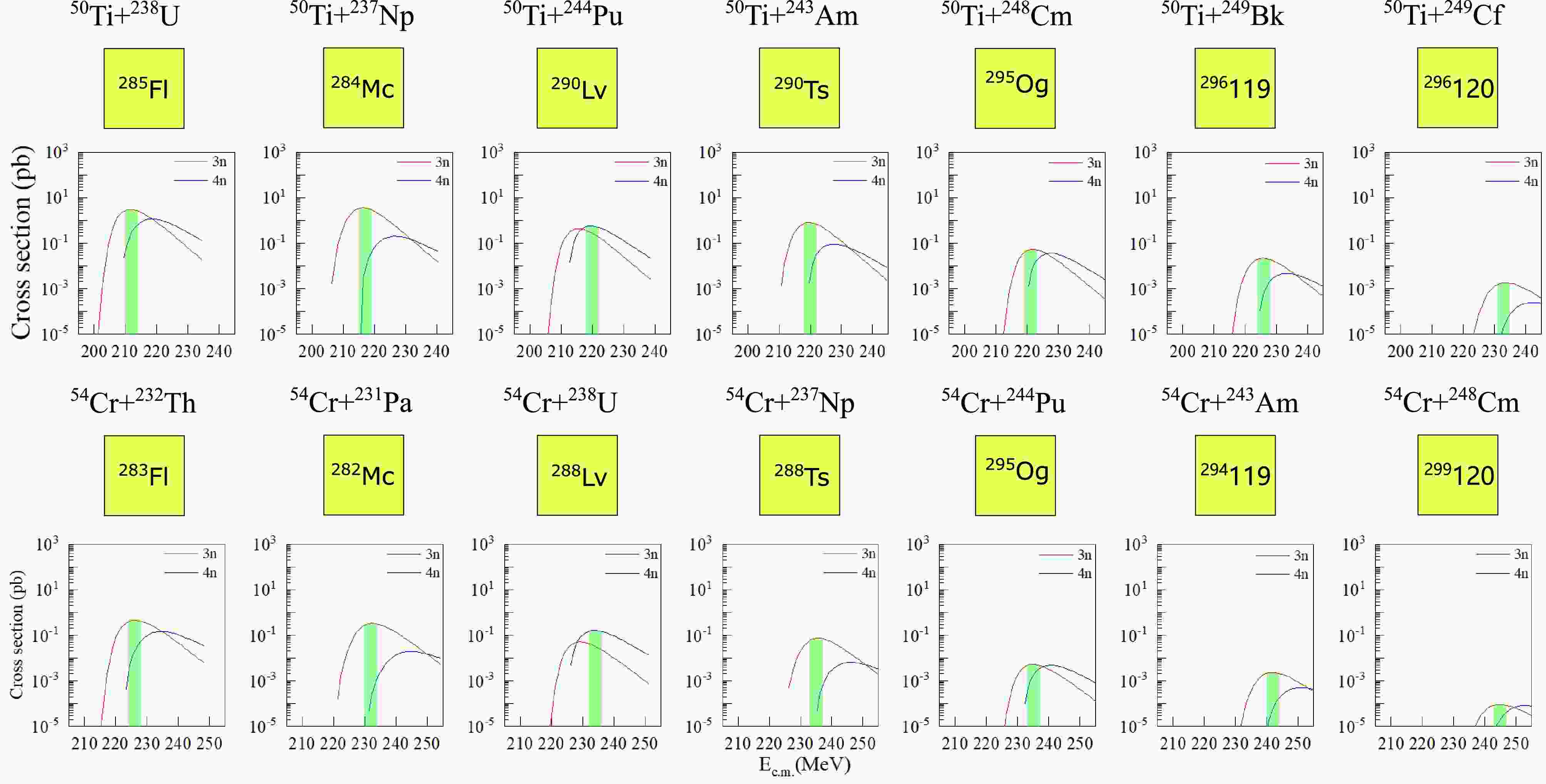 $ Z = 114{-}120 $ using$ ^{50} $ Ti and$ ^{54} $ Cr beams are shown. The red solid line represents the 3n exit channel, and the blue solid line represents the 4n exit channel. The shaded area (green) indicates the distribution of center-of-mass energy corresponding to the maximum production cross-section.According to the current theoretical investigation, the