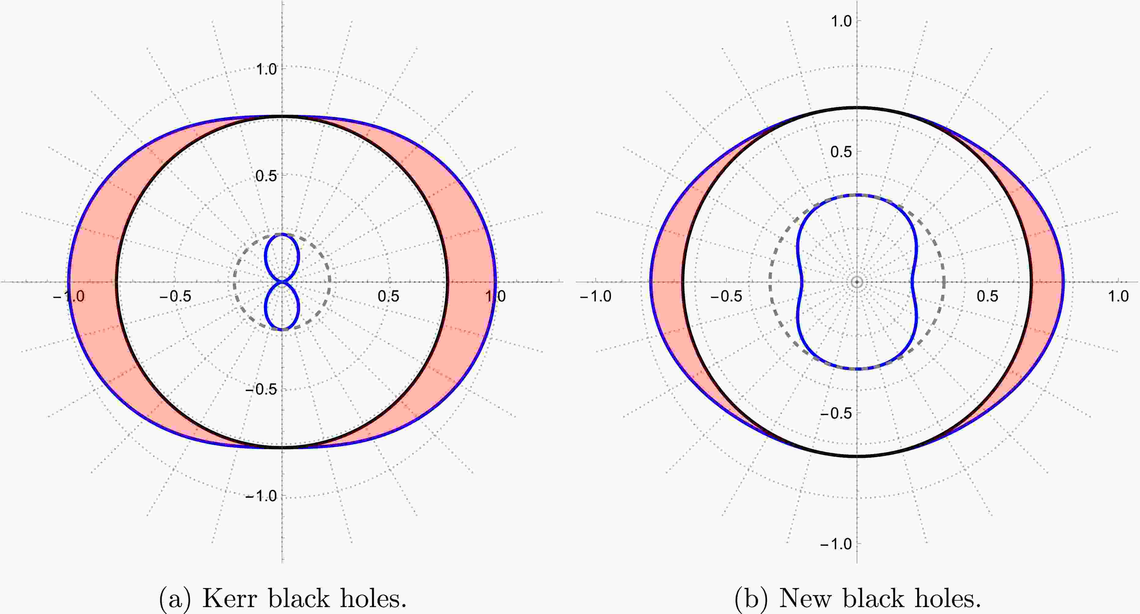 We compare the structure of infinite redshift surfaces, depicted by Eq. (64), with that of Kerr black holes in the polar slice using the Boyer–Lindquist coordinates, as shown in Fig. 1. In this figure, the blue curves indicate the outer and inner radii of the infinite redshift surfaces, whereas the solid black and dashed gray curves represent the outer and inner horizons, respectively. The pink shadows denote the black hole ergospheres. Notably, the infinite redshift surfaces exhibit comparable deformations, particularly at $ \theta = 0 $.