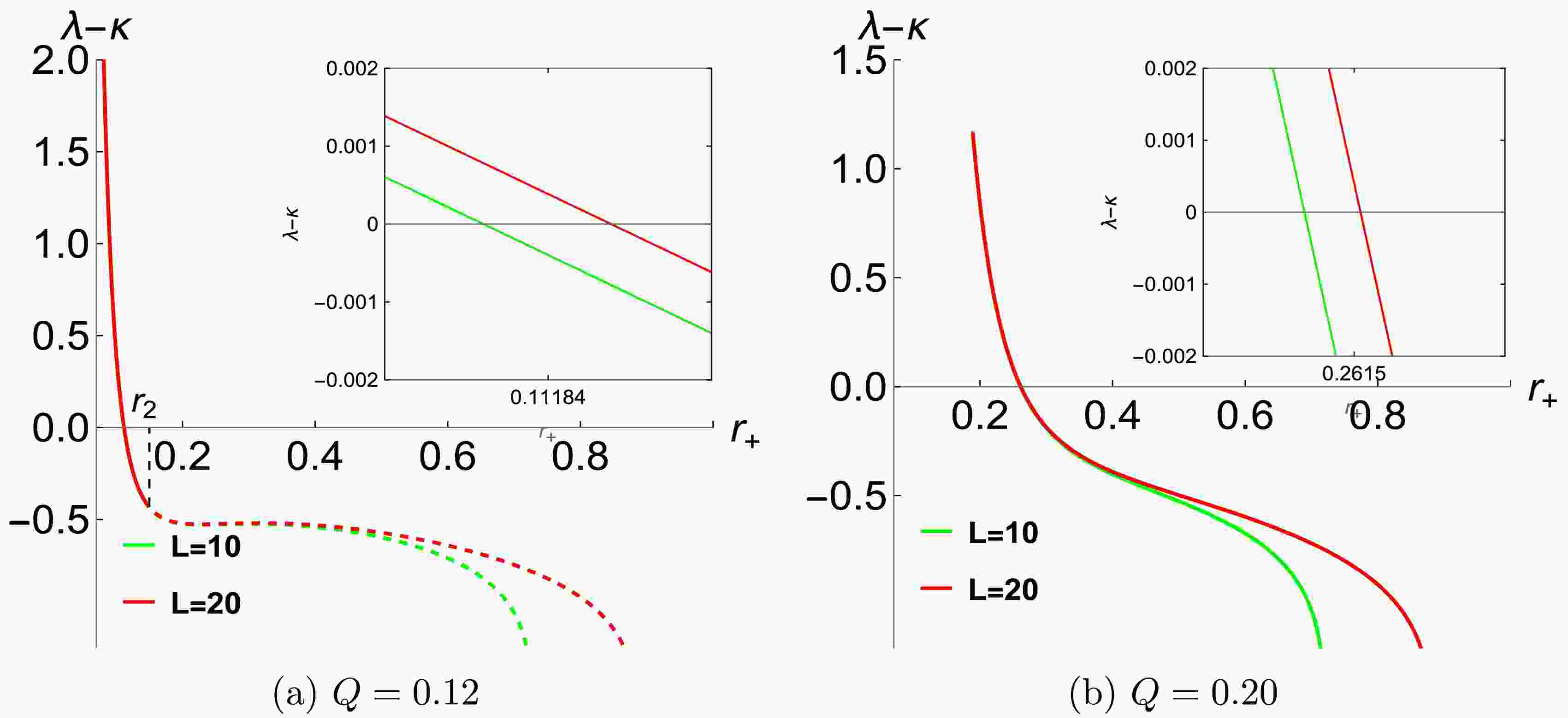 $ {\alpha}=0.04 $ ,$ l=1.00 $ , and get the values at the critical point as follows$ {r}_{+c}=0.411108,\quad {Q}_c=0.168965, \quad {T}_c=0.272423. $