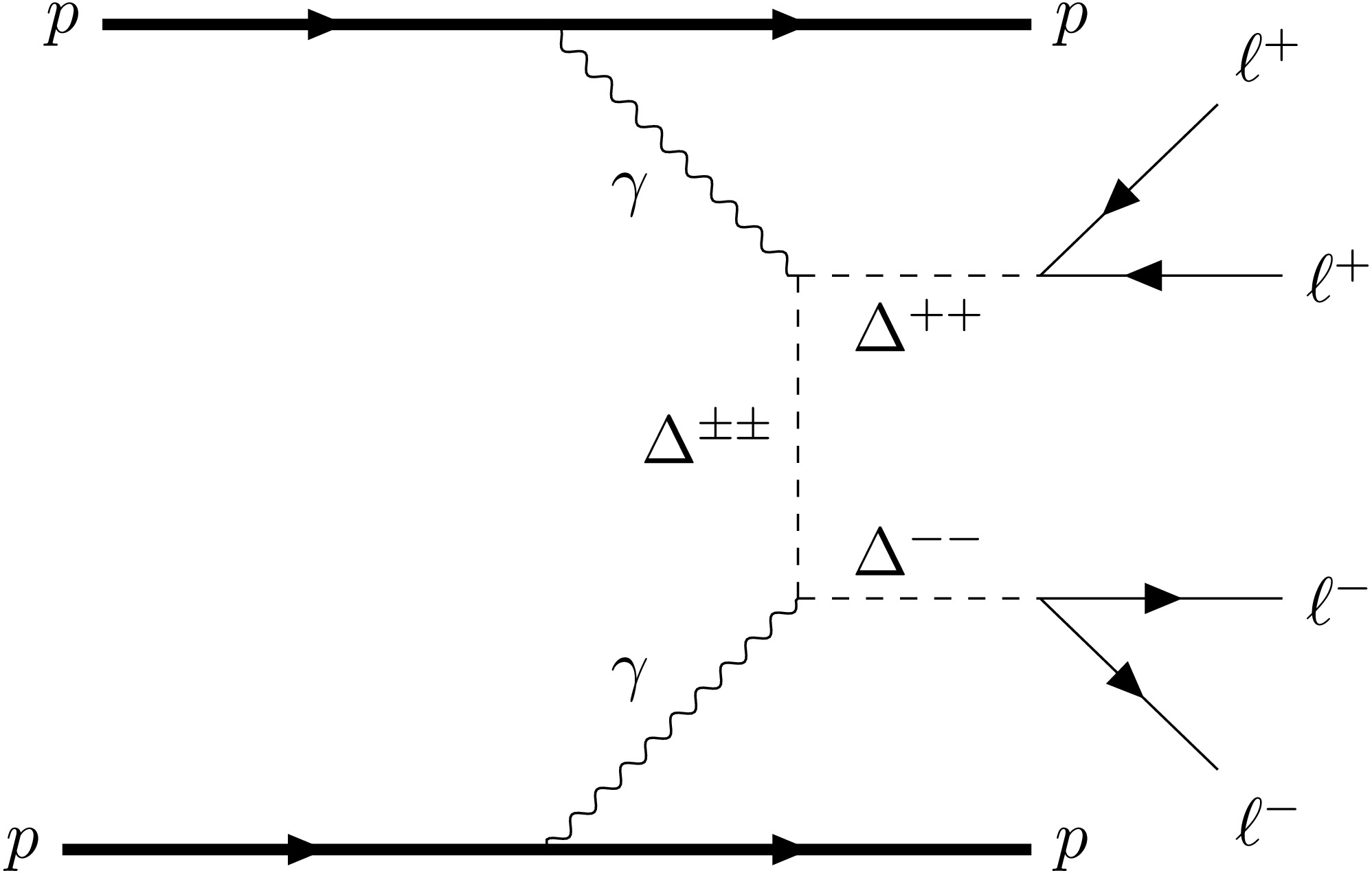 $ v_{\Delta}<10^{-4} $ GeV as discussed in the previous section and decay the doubly charged Higgs bosons into pairs of leptons ($ e^{\pm} $ or$ \mu^{\pm} $ ). Such a process through elastic photon fusion can then be expressed as$ pp\to p(\gamma\gamma\to\Delta^{++}\Delta^{--}\to\ell^+_{1}\ell^+_{2}\ell^-_{3}\ell^-_{4})p\,, $
