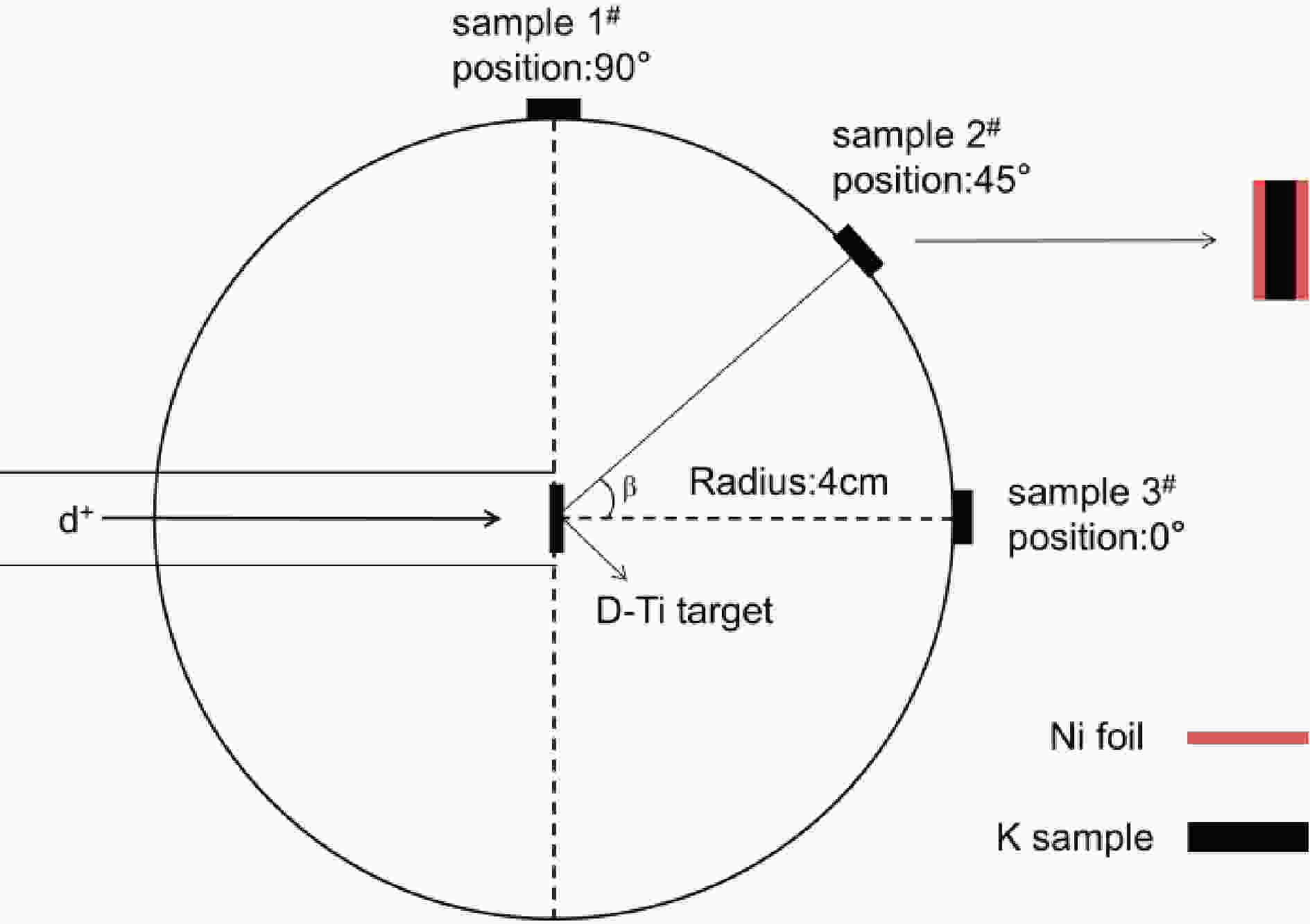 Potassium-bearing samples SK01 sanidine, containing 8.62% potassium, were provided by IGGCAS [24]. The selected SK01 sanidine samples are standard materials used in 40Ar/39Ar geochronology and widely applied in age determination. The detail parameters of samples are shown in Table 2. The information of main reaction 39K(n,p)39Ar is shown in Table 4. Three samples were packed into circular discs of 20 mm diameter. Each labeled sample was sandwiched between two nickel foils (99.99% purity, 0.5 mm thick each foil) of the same diameter, which served as neutron flux monitors. The assembled Ni–SK01–Ni structures were wrapped with plastic film. The wrapped samples were placed at 0°,45°,90° relative to the D+ beam direction and center of the D-Ti target at a distance of approximately 4 cm. The placement diagram of sandwiched samples are shown in Fig. 1.