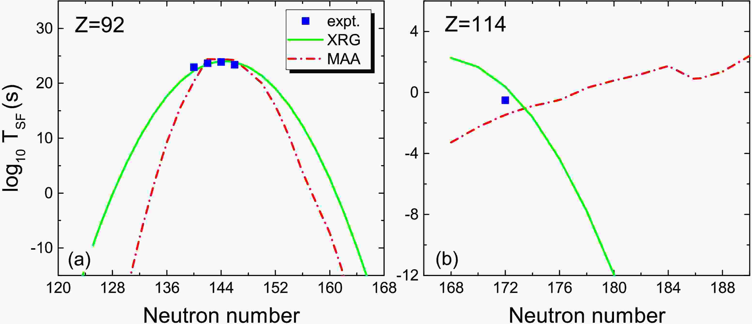 $ (N-Z) $ terms. The microscopic effects are partly considered through$ Q_\alpha $ in Eq.(3). For super-heavy nuclei and nuclei far from the β-stability line, the uncertainties of these two phenomenological formulas are quite large. For example, Fig. 1 shows the predicted$ \log_{10} T_{\rm SF} $ for even-even nuclei with$ Z=92 $ and$ 114 $ by using Eq.(2) and Eq.(3). One can see that the prediction discrepancies between two models are quite large for unknown nuclei. It is therefore necessary to improve the accuracy of SF half-live predictions for unstable heavy and superheavy nuclei.