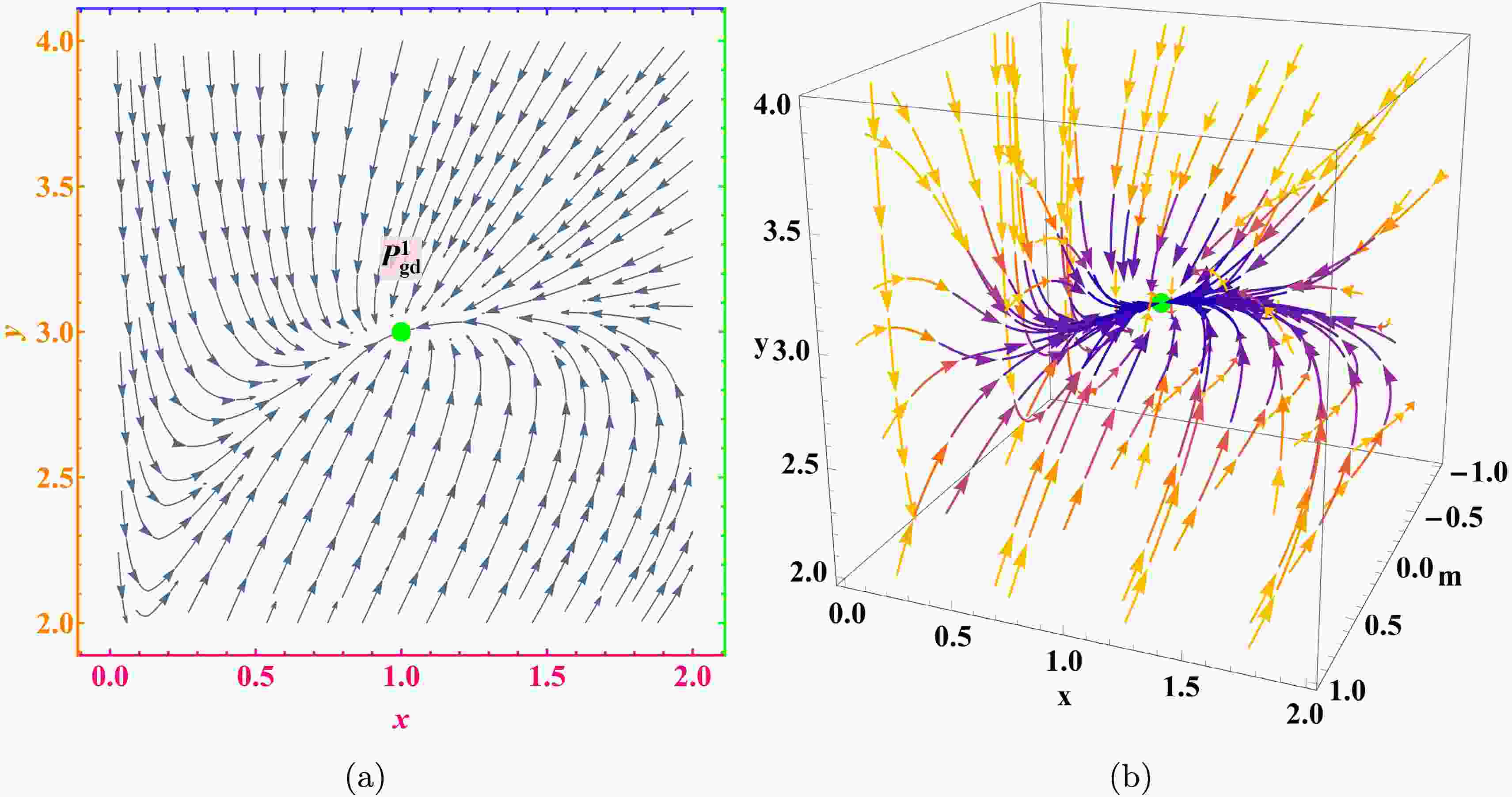 The coordinates and cosmological parameters of both fixed points are summarized in Table 3, and their existence, stability, and acceleration properties are listed in Table 4, where $ \tilde{v} = \beta(\alpha - 1)/(3(\beta - 1)(\alpha - \beta)) $. In the mixed power-law model, both obtained fixed points exhibit one zero eigenvalue and are therefore non-hyperbolic. The central manifold theorem was attempted to assess their stability; however, after decomposing the system into linear and nonlinear components, it was found that the nonlinear terms do not vanish in the vicinity of the equilibrium, thus precluding definitive stability conclusions through this method. Consequently, we specify the condition that the real parts of the eigenvalues $ e_{j3} $, $ e_{j4} $ (with $ j = b, c $) must be negative in Table 4 and present the stability behavior of both points via phase portrait analysis in Fig. 3.