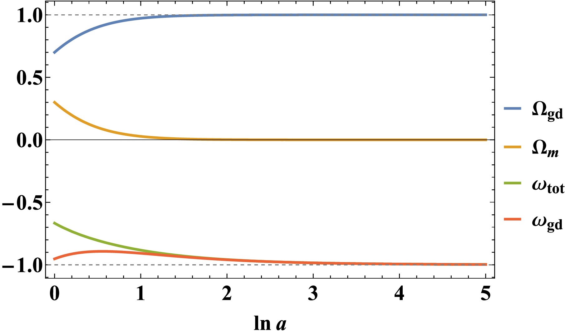 At this fixed point, the cosmological parameters satisfy $ \Omega_m = 0 $ and $ \Omega_{\mathrm{gd}} = 1 $, indicating a universe dominated by geometric dark energy. As a de Sitter point with a scale factor evolving as $ a \sim e^{H_0 t} $, $ P^2_{\mathrm{gd}} $ provides a potential explanation for the current cosmic acceleration within the model, provided it acts as a stable attractor.
