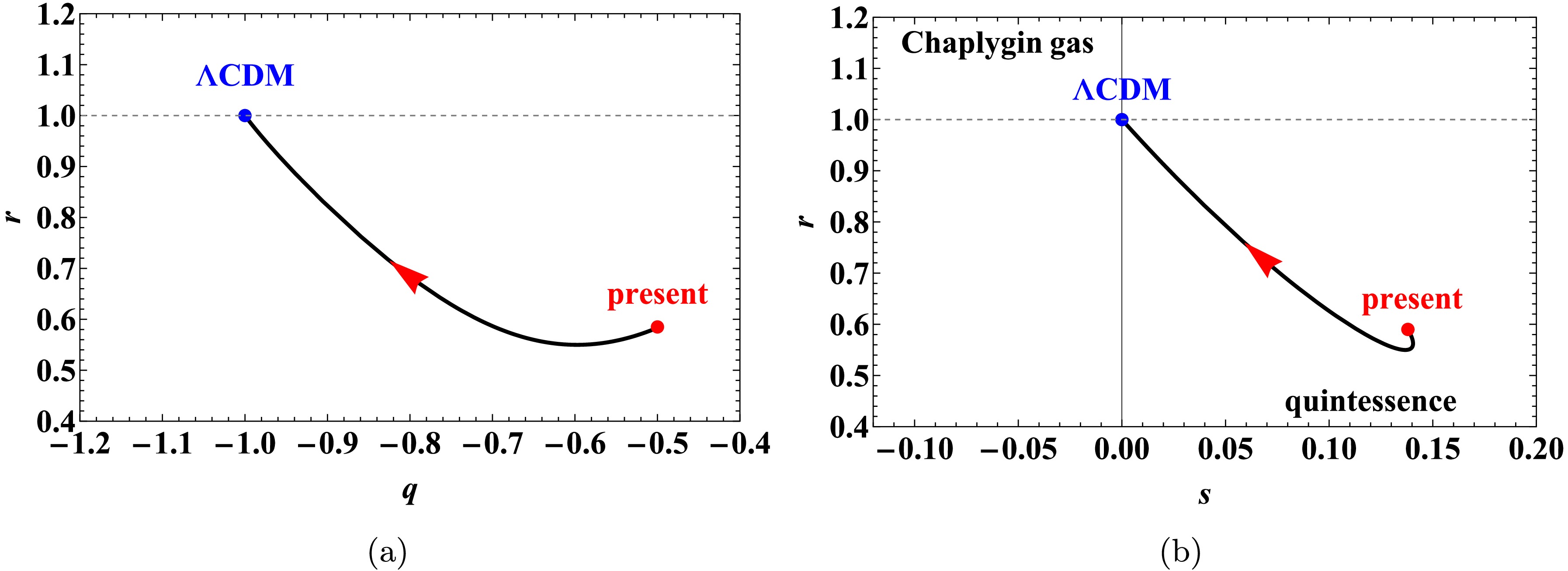 • We apply the statefinder diagnostic to the two cosmological models introduced above. The statefinder parameters r and s, first proposed in [7374], provide a useful tool for distinguishing between different dark energy scenarios. These dimensionless quantities are defined in terms of the scale factor and its higher-order derivatives as follows [73]:
