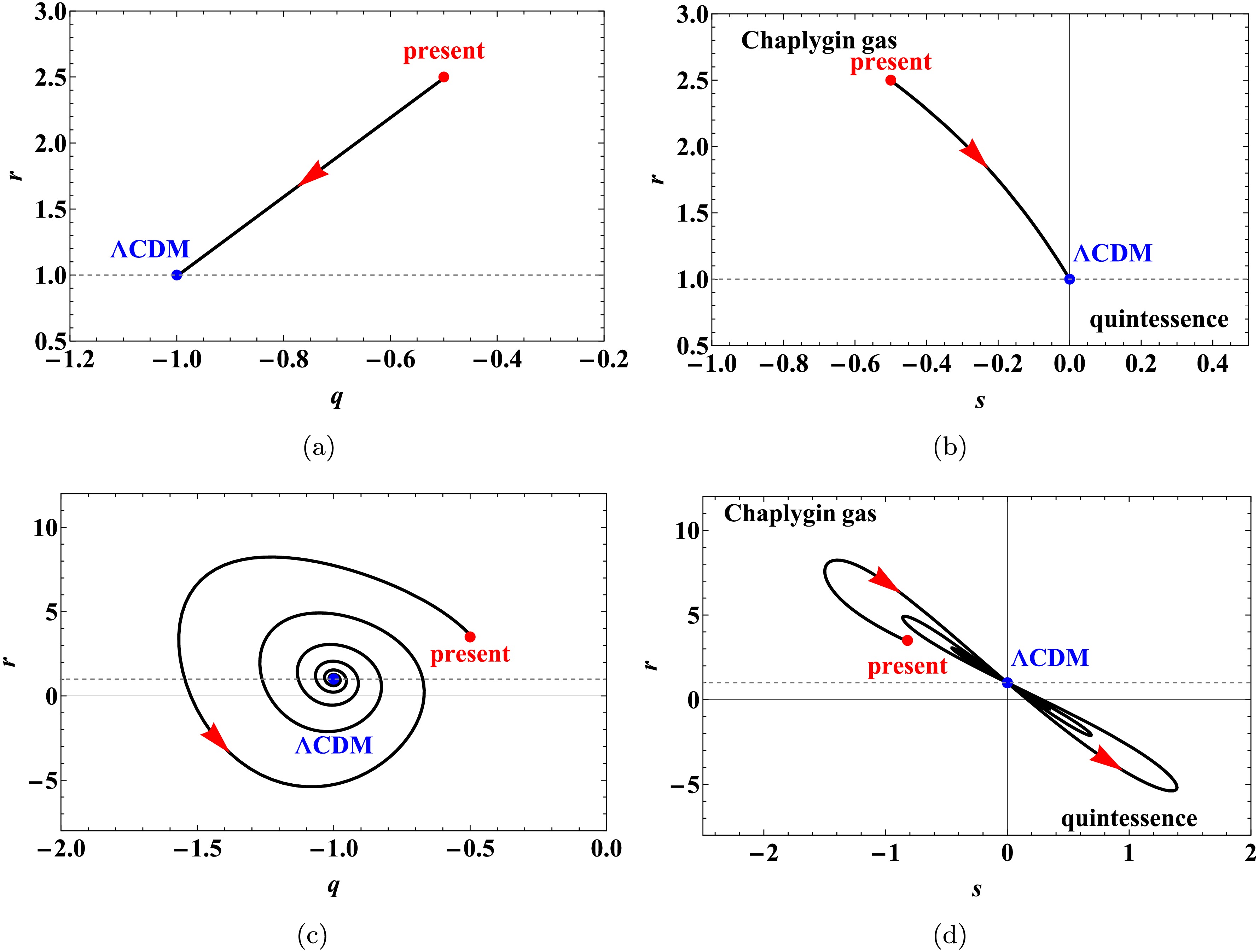 As shown in Fig. 5, the power-law model exhibits dynamical behavior analogous to that of a Chaplygin gas model before asymptotically approaching a ΛCDM-like regime. In Fig. 6, although the mixed power-law model also converges to a ΛCDM-like state in the late-time limit, the evolutionary paths in the r-q and r-s planes differ significantly between the two parameter sets. For $ (\alpha, \beta) = (5, -1000) $, the trajectory remains within the region characteristic of the Chaplygin gas model before reaching the ΛCDM point $ \{r = 1, s = 0\} $. By contrast, for $ (\alpha, \beta) = (5, 2/3) $, the trajectory crosses the ΛCDM point, showing damped transitions between the Chaplygin gas and quintessence regimes. In addition, the trajectory for $ (5, 2/3) $ displays a spiral structure in the r-q plane.