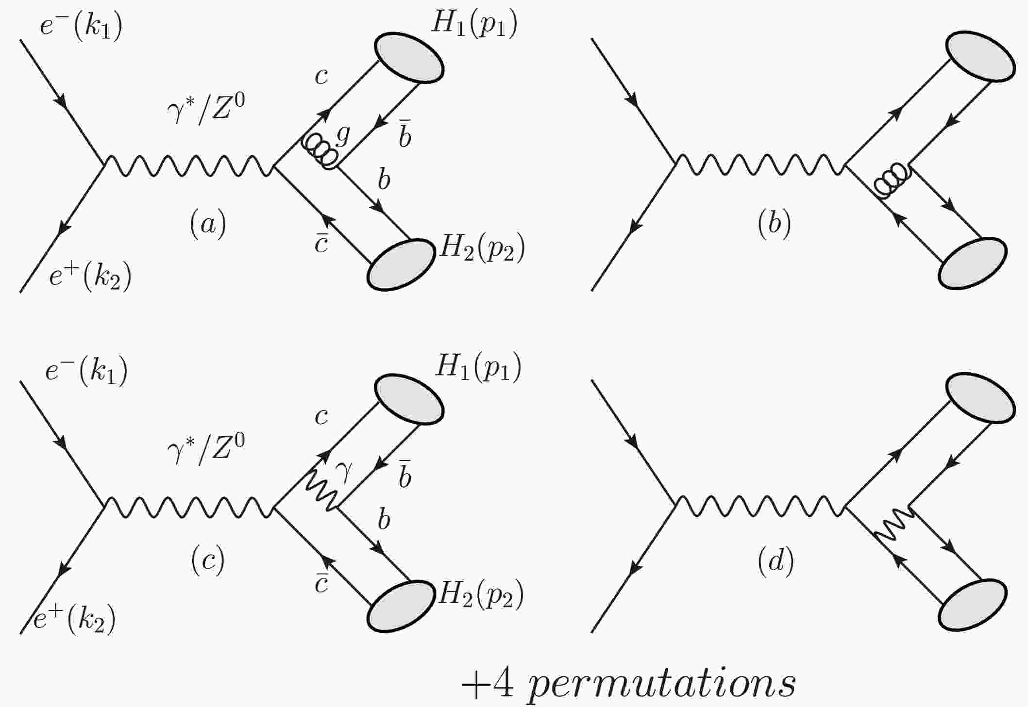 $ e^-(k_1)+e^+(k_2)\rightarrow \gamma^*/Z^0\rightarrow H_1(p_1)+ $ $ H_2(p_2) $ at the tree level.$ H_1, H_2 $ are$ B_c^+(c\bar{b}) $ and$ B_c^-(b\bar{c}) $ (or their respective excited states,$ B_c^{*\pm}, h_{bc}^{\pm}, \chi_{bcJ}^{\pm} (J=0,1,2) $ ), respectively. The permutation diagrams can be obtained by reversing the quark lines and exchanging$ b,c $ quarks. (a) and (b) diagrams belonging to QCD channels, (c) and (d) diagrams belonging to EW channels.$ \begin{aligned}[b] p_c&=\dfrac{E_c}{E_c+E_{\bar{b}}}p_1+q_1,\\ p_{\bar{b}}&=\dfrac{E_{\bar{b}}}{E_c+E_{\bar{b}}}p_1-q_1,\\ p_b&=\dfrac{E_b}{E_{\bar{c}}+E_b}p_2+q_2,\\ p_{\bar{c}}&=\dfrac{E_{\bar{c}}}{E_{\bar{c}}+E_b}p_2-q_2 ,\end{aligned} $