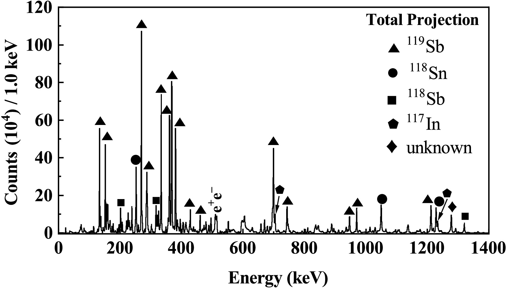 $ \gamma-\gamma $ matrix. Triangles, circles, squares, and pentagons denote transitions from$ ^{119} {\rm{Sb}}$ ,$ ^{118} {\rm{Sn}}$ ,$ ^{118} {\rm{Sb}}$ , and$ ^{117} {\rm{In}}$ , respectively. The diamond represents a transition of unknown origin. The transitions of$ ^{118} {\rm{Sn}}$ are primarily from the β-decay of$ ^{118} {\rm{Sb}}$ . -