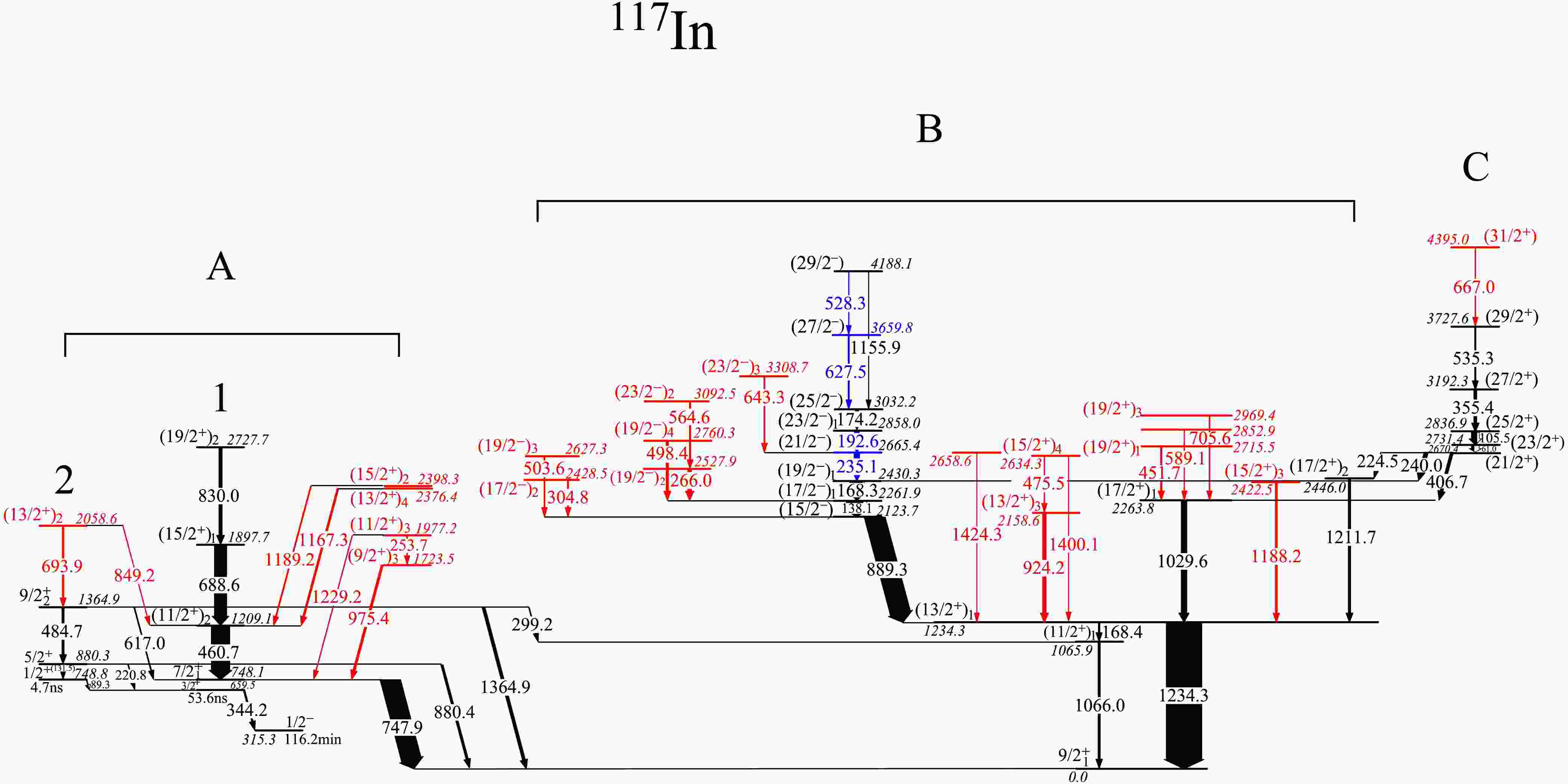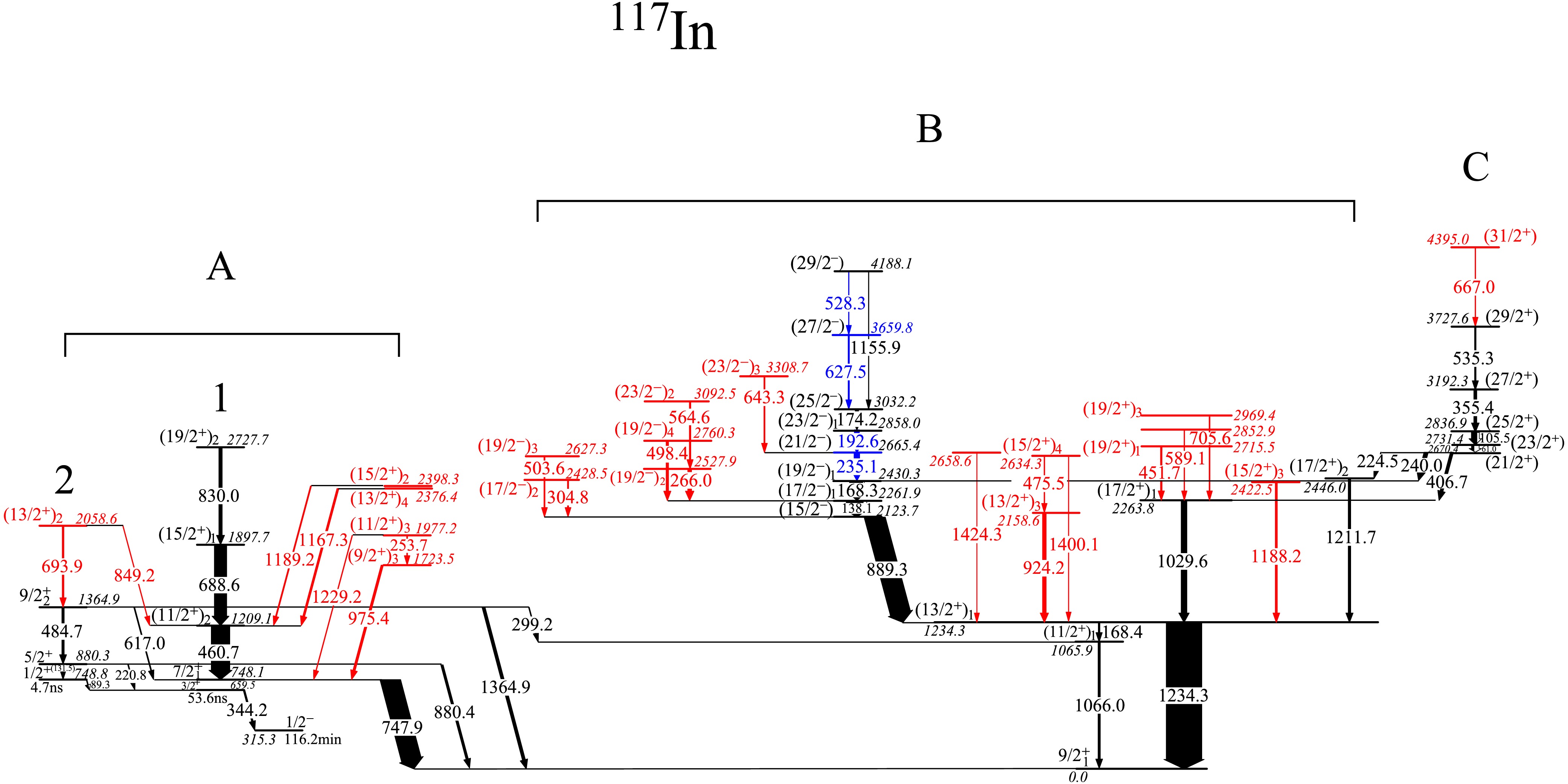 $ ^{117} {\rm{In}}$ . New transitions are marked in red. Transitions belonging to$ ^{117} {\rm{In}}$ but not shown in the level scheme are in blue. Circles indicate transitions from$ ^{118} {\rm{Sn}}$ contaminants, and stars correspond to transitions from$ ^{116} {\rm{Sn}}$ . The diamond represents a transition of unknown origin. Squares represent contaminants from$ ^{118} {\rm{Sb}}$ , and triangles denote those from$ ^{119} {\rm{Sb}}$ .$ E_{\gamma} $ /keV$ E_{i} $ /keV$ E_{f} $ /keV$ I_{\gamma} $ ADO ratio Multipolarity $ I_i^{\pi} $ $ \rightarrow $ $ I_f^{\pi} $ 61.0 2731.4 2670.4 6.8(2.0) (23/2+) $ \rightarrow $ (21/2+)89.3 748.8 659.5 1.3(0.3) 1/2+ $ \rightarrow $ 3/2+105.5 2836.9 2731.4 15.4(2.1) 1.13(0.22) M1/E2 (25/2+) $ \rightarrow $ (23/2+)138.1 2261.9 2123.7 47.7(3.4) 0.93(0.08) M1/E2 (17/2−)1 $ \rightarrow $ (15/2−)168.3 2430.3 2261.9 34.0(2.5) 0.73(0.06) M1/E2 (19/2−)1 $ \rightarrow $ (17/2−)1168.4 1234.3 1065.9 4.0(0.9) (13/2+)1 $ \rightarrow $ (11/2+)1174.2 3032.2 2858.0 8.5(0.7) 0.84(0.11) M1/E2 (25/2−) $ \rightarrow $ (23/2−)1192.6 2858.0 2665.4 12.8(1.0) 0.83(0.09) M1/E2 (23/2−)1 $ \rightarrow $ (21/2−)220.8 880.3 659.5 2.6(0.3) 0.83(0.24) M1/E2 5/2+ $ \rightarrow $ 3/2+224.5 2670.4 2446.0 1.7(0.4) (21/2+) $ \rightarrow $ (17/2+)2235.1 2665.4 2430.3 14.9(1.1) 0.95(0.09) M1/E2 (21/2−) $ \rightarrow $ (19/2−)1240.0 2670.4 2430.3 11.3(0.9) 0.84(0.09) E1 (21/2+) $ \rightarrow $ (19/2−)1253.7 1977.2 1723.5 2.3(0.5) 0.89(0.29) M1/E2 (11/2+)3 $ \rightarrow $ (9/2+)3266.0 2527.9 2261.9 9.2(0.8) 0.96(0.12) M1/E2 (19/2−)2 $ \rightarrow $ (17/2−)1299.2 1364.9 1065.9 2.1(0.6) 0.98(0.22) M1/E2 9/22+ $ \rightarrow $ (11/2+)1304.8 2428.5 2123.7 3.0(0.3) 1.06(0.20) M1/E2 (17/2−)2 $ \rightarrow $ (15/2−)344.2 659.5 315.3 4.5(0.4) 0.78(0.22) E1 3/2+ $ \rightarrow $ 1/2−355.4 3192.3 2836.9 8.1(1.4) 1.11(0.22) M1/E2 (27/2+) $ \rightarrow $ (25/2+)406.7 2670.4 2263.8 8.1(1.0) 1.50(0.17) E2 (21/2+) $ \rightarrow $ (17/2+)1451.7 2715.5 2263.8 4.2(0.6) 0.94(0.18) M1/E2 (19/2+)1 $ \rightarrow $ (17/2+)1460.7 1209.1 748.1 52.0(3.9) 1.32(0.10) E2 (11/2+)2 $ \rightarrow $ 7/21+475.5 2634.3 2158.6 1.9(0.3) 0.92(0.27) M1/E2 (15/2+)4 $ \rightarrow $ (13/2+)3484.7 1364.9 880.3 6.4(1.7) 1.32(0.29) E2 9/22+ $ \rightarrow $ 5/2+498.4 2760.3 2261.9 6.1(0.6) 1.05(0.17) M1/E2 (19/2−)4 $ \rightarrow $ (17/2−)1503.6 2627.3 2123.7 2.8(0.3) 1.40(0.29) E2 (19/2−)3 $ \rightarrow $ (15/2−)528.3 4188.1 3659.8 1.2(0.3) (29/2−) $ \rightarrow $ (27/2−)535.3 3727.6 3192.3 4.0(1.0) 0.95(0.19) M1/E2 (29/2+) $ \rightarrow $ (27/2+)564.6 3092.5 2527.9 3.9(0.5) 1.26(0.27) E2 (23/2−)2 $ \rightarrow $ (19/2−)2589.1 2852.9 2263.8 1.6(0.3) $ \rightarrow $ (17/2+)1617.0 1364.9 748.1 2.6(0.4) 0.92(0.25) M1/E2 9/22+ $ \rightarrow $ 7/21+627.5 3659.8 3032.2 3.3(0.5) 1.02(0.17) M1/E2 (27/2−) $ \rightarrow $ (25/2−)643.3 3308.7 2665.4 2.8(0.4) 1.02(0.24) M1/E2 (23/2−)3 $ \rightarrow $ (21/2−)667.0 4395.0 3727.6 1.6(0.6) (color online) (31/2+) $ \rightarrow $ (29/2+)688.6 1897.7 1209.1 34.8(2.6) 1.35(0.13) E2 (15/2+)1 $ \rightarrow $ (11/2+)2693.9 2058.6 1364.9 4.6(1.3) 1.42(0.32) E2 (13/2+)2 $ \rightarrow $ 9/22+705.6 2969.4 2263.8 2.5(0.3) 0.77(0.20) M1/E2 (19/2+)3 $ \rightarrow $ (17/2+)1747.9 748.1 0.0 56.6(4.1) 0.95(0.08) M1/E2 7/21+ $ \rightarrow $ 9/21+830.0 2727.7 1897.7 9.5(0.9) 1.26(0.26) E2 (19/2+)2 $ \rightarrow $ (15/2+)1849.2 2058.6 1209.1 1.4(0.4) (13/2+)2 $ \rightarrow $ (11/2+)2880.4 880.3 0.0 6.5(0.5) 1.23(0.25) E2 5/2+ $ \rightarrow $ 9/21+889.3 2123.7 1234.3 57.6(4.1) 0.84(0.07) E1 (15/2−) $ \rightarrow $ (13/2+)1924.2 2158.6 1234.3 10.0(0.8) 1.23(0.14) M1/E2( $ \Delta I $ = 0)(13/2+)3 $ \rightarrow $ (13/2+)1975.4 1723.5 748.1 6.2(0.7) 0.78(0.13) M1/E2 (9/2+)3 $ \rightarrow $ 7/21+1029.6 2263.8 1234.3 15.9(1.2) 1.37(0.14) E2 (17/2+)1 $ \rightarrow $ (13/2+)11066.0 1065.9 0.0 6.1(0.7) 1.15(0.15) M1/E2 (11/2+)1 $ \rightarrow $ 9/21+1155.9 4188.1 3032.2 1.0(0.3) (29/2−) $ \rightarrow $ (25/2−)1167.3 2376.4 1209.1 5.3(0.6) 0.72(0.12) M1/E2 (13/2+)4 $ \rightarrow $ (11/2+)21188.2 2422.5 1234.3 5.5(0.5) 0.96(0.13) M1/E2 (15/2+)3 $ \rightarrow $ (13/2+)11189.2 2398.3 1209.1 3.0(0.5) 1.42(0.36) E2 (15/2+)2 $ \rightarrow $ (11/2+)21211.7 2446.0 1234.3 6.9(0.6) 1.39(0.29) E2 (17/2+)2 $ \rightarrow $ (13/2+)11229.2 1977.2 748.1 1.1(0.3) (11/2+)3 $ \rightarrow $ 7/21+1234.3 1234.3 0.0 100.0(5.0) 1.38(0.11) E2 (13/2+)1 $ \rightarrow $ 9/21+1364.9 1364.9 0.0 8.4(2.2) 1.27(0.24) M1/E2( $ \Delta I $ = 0)9/22+ $ \rightarrow $ 9/21+1400.1 2634.3 1234.3 1.0(0.3) (15/2+)4 $ \rightarrow $ (13/2+)11424.3 2658.6 1234.3 1.2(0.3) $ \rightarrow $ (13/2+)1Table 1. γ-ray energies, level energies of the initial and final states, relative intensities, ADO ratios, multipolarities, and spin-parity assignments of the initial and final states for the transitions in