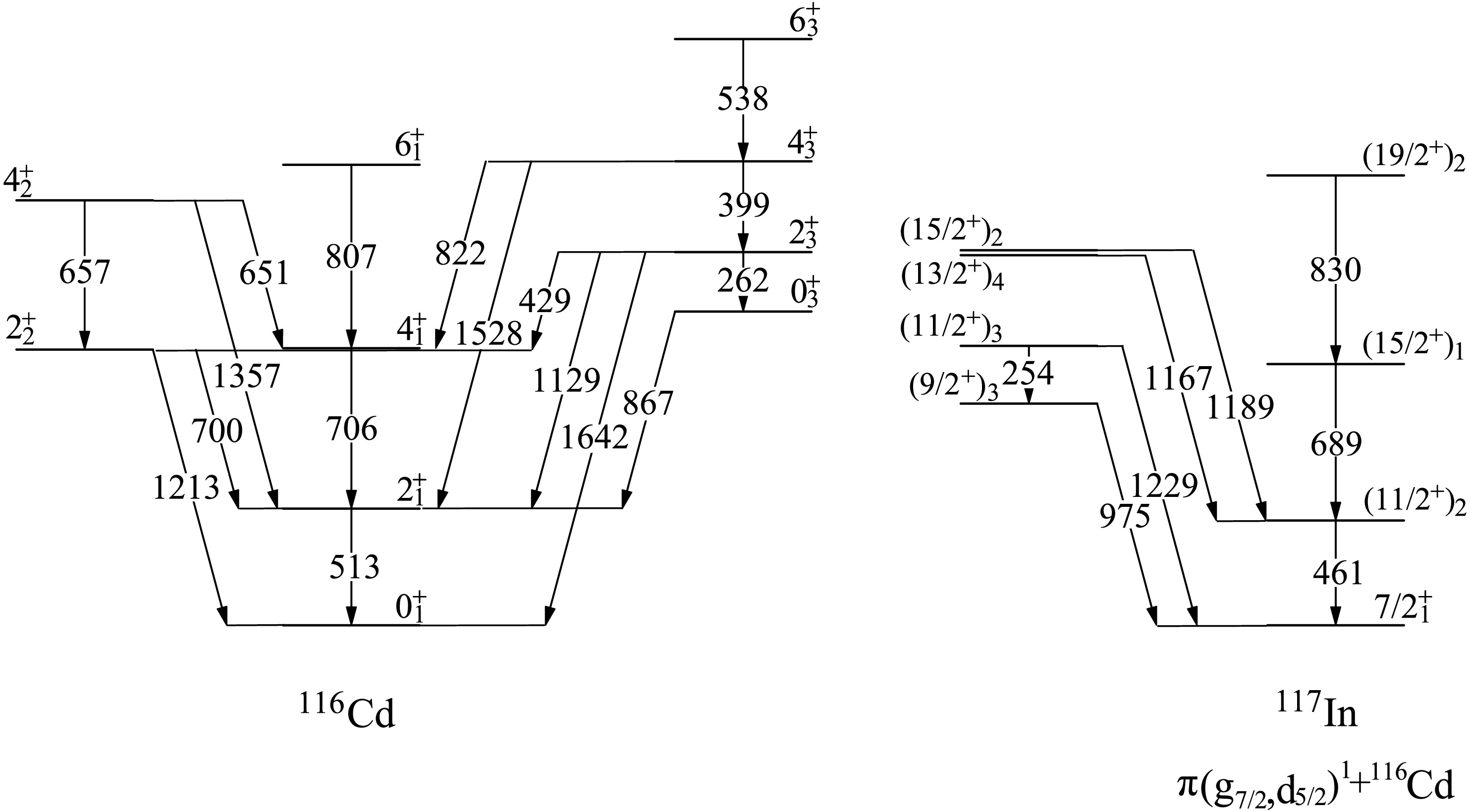 $ \Delta I = 0 $ dipole transition. Based on the assumption that spin increases with excitation energy, it is assigned as a quadrupole transition. Therefore, the spin-parities of the 2376.4 and 2398.3 keV levels are assigned as (13/2+) and (15/2+), respectively. Because these four levels do not form a clear band structure, only tentative interpretations based on the current level scheme are proposed in the present work. Figure 4 displays a comparison between the low-lying excited states in$ ^{116} {\rm{Cd}}$ [43, 44] and the levels in structure A of$ ^{117} {\rm{In}}$ . The energy of the$ 7/2^+_1 $ level in$ ^{117} {\rm{In}}$ is set as 0 for the convenience of comparison. As shown in Fig. 4, the (9/2+)3, (11/2+)3 and (13/2+)4, (15/2+)2 states in$ ^{117} {\rm{In}}$ exhibit similar energies and decay behaviors to the 22+ and 42+ states in$ ^{116} {\rm{Cd}}$ , respectively. Therefore, the (9/2+)3, (11/2+)3 and (13/2+)4, (15/2+)2 states in$ ^{117} {\rm{In}}$ are tentatively interpreted as two sets of multiplets originating from the$ \pi (g_{7/2},d_{5/2}) \otimes $ ($ ^{116} {\rm{Cd}}$ , 22+) and$ \pi (g_{7/2},d_{5/2}) \otimes $ ($ ^{116} {\rm{Cd}}$ , 42+) configurations, respectively. The 22+ and 42+ states in$ ^{116} {\rm{Cd}}$ have been explained as originating from collective vibration [44]. Thus, the (9/2+)3, (11/2+)3 and (13/2+)4, and (15/2+)2 levels in$ ^{117} {\rm{In}}$ may also originate from vibrational excitations. -