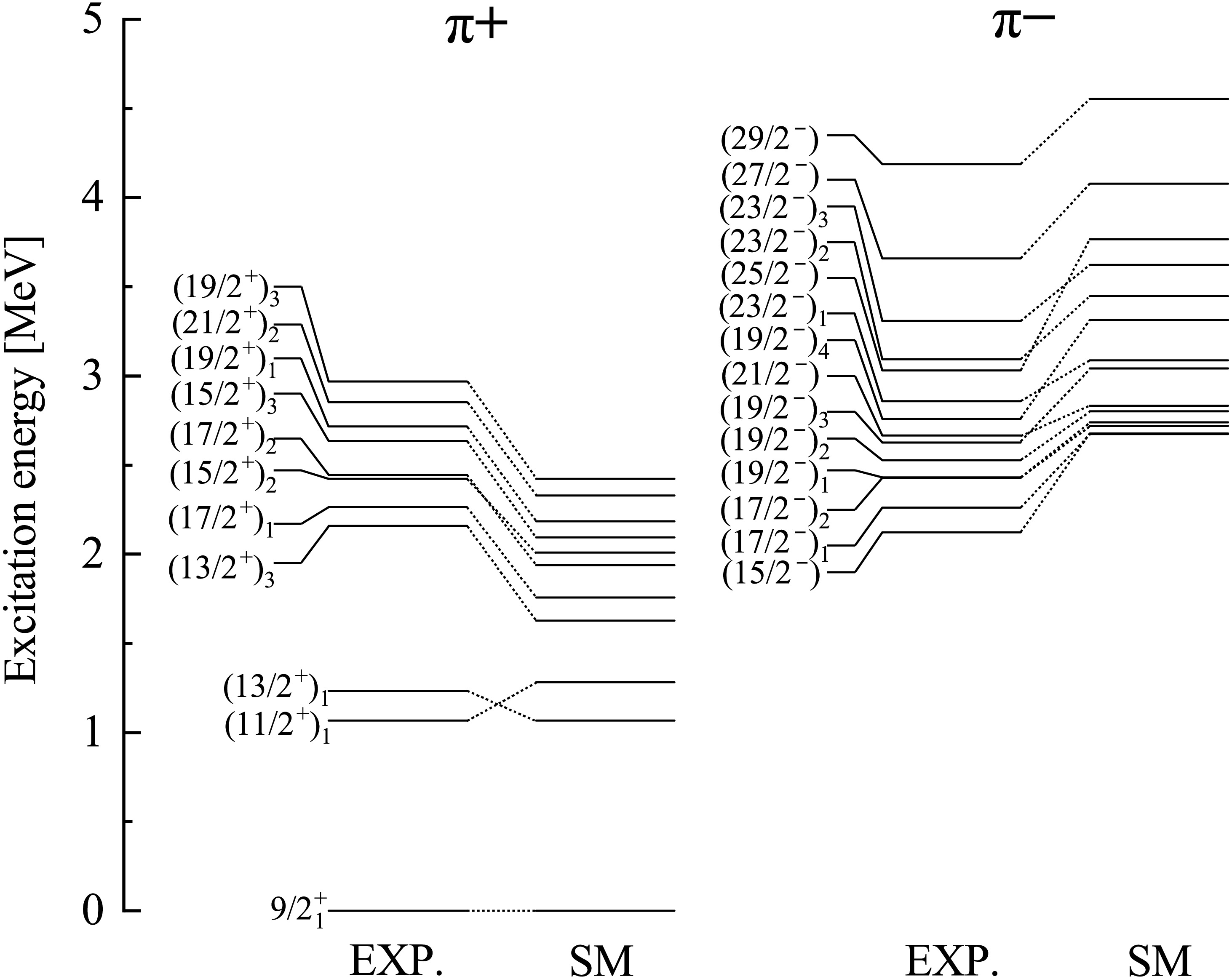 $ ^{117} {\rm{In}}$ using the NUSHELLX code within the SNE model space [45]. The adopted two-body matrix elements are named SNET in the code [45]. The SNE model space includes eight proton orbitals ($ \pi 1f_{5/2} $ ,$ \pi 2p_{3/2} $ ,$ \pi 2p_{1/2} $ ,$ \pi 1g_{9/2} $ ,$ \pi 1g_{7/2} $ ,$ \pi 2d_{5/2} $ ,$ \pi 2d_{3/2} $ , and$ \pi 3s_{1/2} $ ) and nine neutron orbitals ($ \nu 1f_{5/2} $ ,$ \nu 2p_{3/2} $ ,$ \nu 2p_{1/2} $ ,$ \nu 1g_{9/2} $ ,$ \nu 1g_{7/2} $ ,$ \nu 2d_{5/2} $ ,$ \nu 2d_{3/2} $ ,$ \nu 3s_{1/2} $ , and$ \nu 1h_{11/2} $ ). To make the calculation feasible, the following truncation was used. The$ \pi 1f_{5/2} $ ,$ \pi 2p_{3/2} $ , and$ \pi 2p_{1/2} $ orbitals and$ \nu 1f_{5/2} $ ,$ \nu 2p_{3/2} $ ,$ \nu 2p_{1/2} $ , and$ \nu 1g_{9/2} $ orbitals were kept fully occupied. The$ \pi 1g_{9/2} $ orbital was occupied by nine protons. At least six neutrons were constrained on the$ \nu 1g_{7/2} $ orbital and four neutrons were constrained on the$ \nu 2d_{5/2} $ orbital. No restrictions were applied to the$ \nu 2d_{3/2} $ and$ \nu 3s_{1/2} $ orbitals. A maximum of two neutrons were permitted in the$ \nu 1h_{11/2} $ orbital.A comparison of the calculated results with the experimental level energies is shown in Fig. 5. As shown in Fig. 5, the calculated excitation energies are in rough agreement with the experimental values. Table 2 displays the experimental and calculated level energies, as well as dominant configurations of the states in structure B. For the positive-parity states, the 9/21+ ground state is attributed to the valance proton occupying the