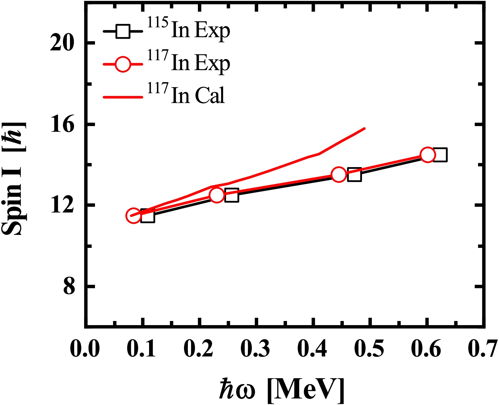 $ \pi g_{9/2}^{-1} \otimes \nu h_{11/2}^{2} $ configuration [42]. Similar band structure has been observed in neighbouring$ ^{115} {\rm{In}}$ [15]. To investigate the nature of structure C in$ ^{117} {\rm{In}}$ , we performed the calculations of the tilted axis cranking model based on covariant density functional theory (TAC-CDFT) with the PC-PK1 parameter [46]. In the calculations, a basis of eight major harmonic oscillator shells was adopted, and pairing correlations were neglected. The calculated spins, as a function of rotational frequency, were compared with the corresponding experimental values of$ ^{117} {\rm{In}}$ , and the results are presented in Fig. 6. Figure 6 also displays the experimental values of the band with the$ \pi g_{9/2}^{-1} \otimes \nu h_{11/2}^{2} $ configuration of$ ^{115} {\rm{In}}$ for comparison. As shown in Fig. 6, the experimental spin-frequency curve of structure C in$ ^{117} {\rm{In}}$ is very similar to that of$ ^{115} {\rm{In}}$ , and the calculations reproduce the experimental values reasonably. These agreements further support the current configuration assignment for structure C of$ ^{117} {\rm{In}}$ .