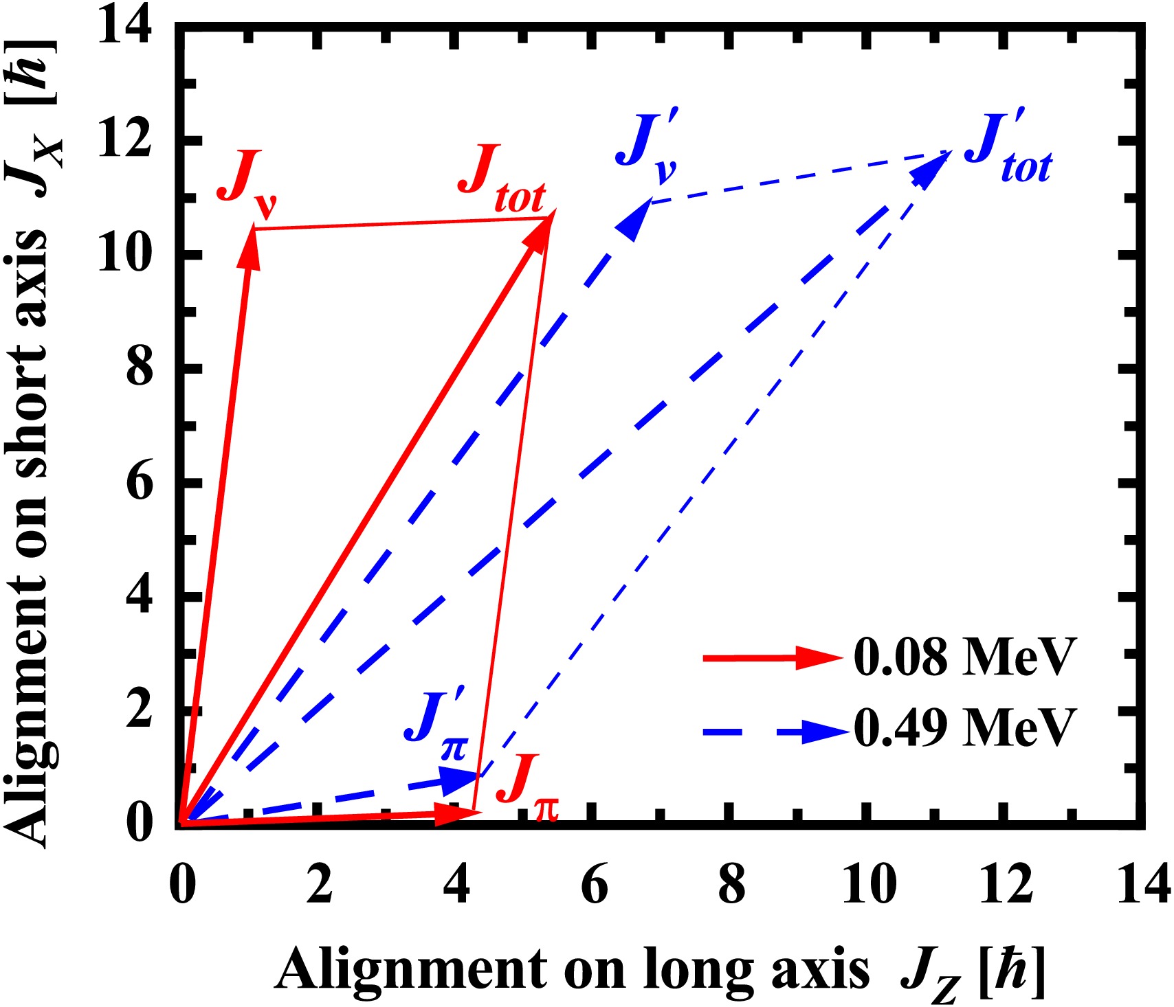 $ ^{117} {\rm{In}}$ . These vectors include the proton angular momentum$ J_{\pi} $ , neutron angular momentum$ J_{\nu} $ , and total angular momentum$ J_{tot} $ =$ J_{\pi} $ +$ J_{\nu} $ .$ J_{\pi} $ and$ J_{\nu} $ represent the sums of the angular momentum expectation values of all the protons and neutrons, respectively. As shown in Fig. 7, at the bandhead ($ \hbar \omega \sim $ 0.08 MeV), the proton and neutron angular momenta primarily align with the long and short axes, respectively. As the rotational frequency increases, the proton angular momentum$ J_{\pi} $ remains nearly stationary, whereas the neutron angular momentum$ J_{\nu} $ gradually moves toward the direction of$ J_{\pi} $ . Consequently, the orientation of the total angular momentum exhibits a noticeable change. The evolution of the angular momenta from low to high frequencies is similar to that observed in$ ^{115} {\rm{In}}$ , resembling the closing process of a stapler. Therefore, structure C in$ ^{117} {\rm{In}}$ is suggested as a "stapler" band.