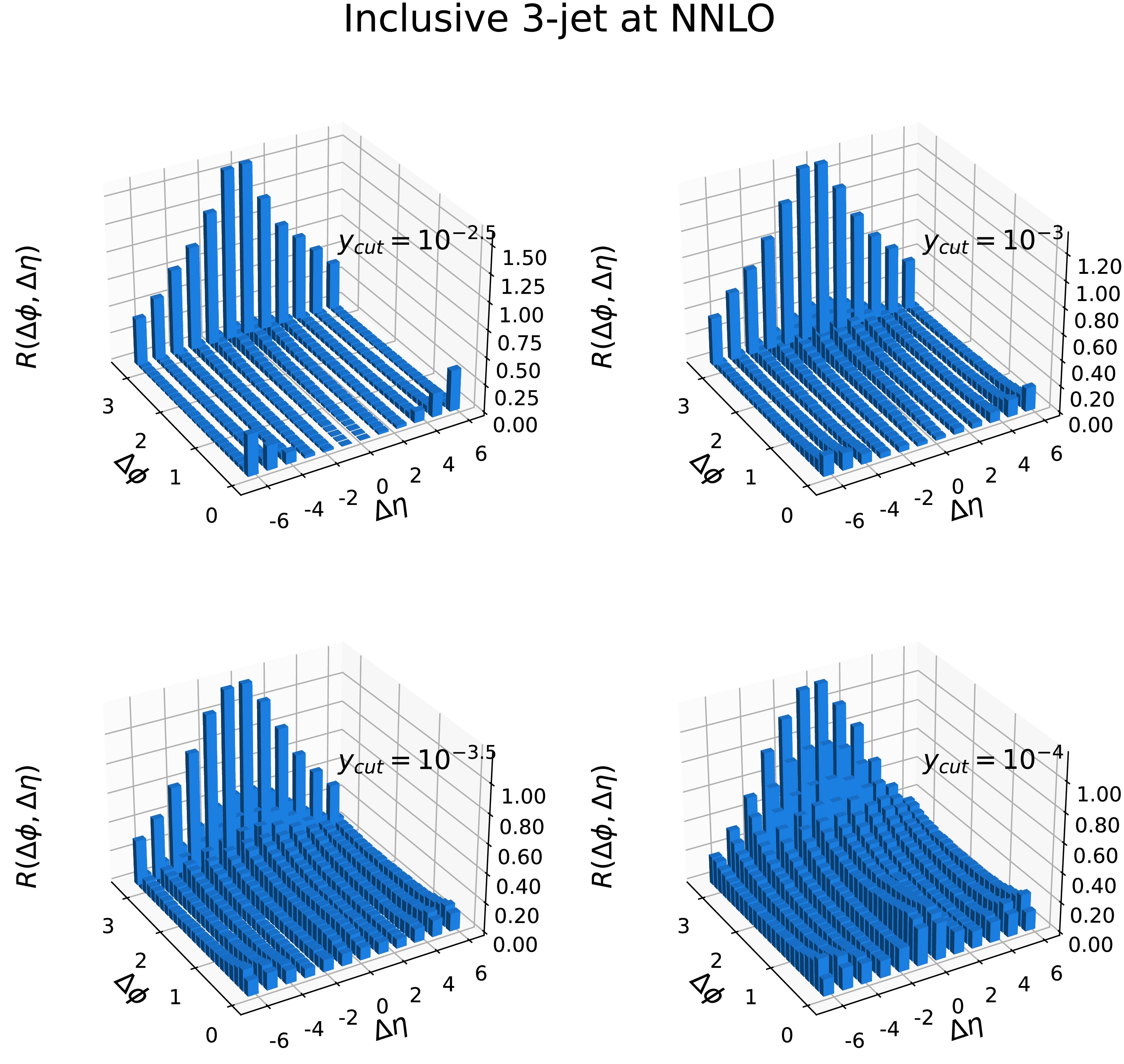 $ y_{\text{cut}} $ . Figure 11 and Fig. 12 present the distribution of the Ridge in the inclusive 3-jet and 4-jet events, respectively. Specifically, for each figure, the distribution is shown for different values of$ y_{\text{cut}} $ :$ y_{\text{cut}} = 10^{-2.5} $ is presented in the upper-left part of the figure,$ y_{\text{cut}} = 10^{-3} $ in the upper-right part,$ y_{\text{cut}} = 10^{-3.5} $ in the lower-left part, and$ y_{\text{cut}} = 10^{-4} $ in the lower-right part. In Fig. 11, as the value of$ y_{\text{cut}} $ decreases, we observe that the event distributions in the intermediate$ \Delta\phi $ region gradually increase, indicating that the proportion of the inclusive 4-jet events is increasing. From Table 1, we observe that the proportion of the inclusive 4-jet events becomes predominant when$ y_{\text{cut}} = 10^{-4} $ . Thus, the distribution with the central scale choice in the lower right panel of Fig. 11 is analogous to that in the lower right panel of Fig. 12. In the region of$ (\Delta\phi,\Delta\eta)= (0,0) $ , allowing closer partons to be resolved as separate jets as$ y_{\text{cut}} $ decreases, the distribution in this area increases. Similarly, the distribution in the large$ \Delta \eta $ region also increases, attributed to the same factor. We have also calculated the corresponding PYTHIA results for$ y_{\text{cut}}=10^{-2} $ . The ridge phenomenon is observed in all these results (see Appendix C). Therefore, the parton shower does not change the conclusion from the fixed order calculation, i.e, the events are planar. We suspect that the non-perturbative effects, similar to the hadronization, can also transfer this contribution to the hadron system as partially observed in Ref. [35].