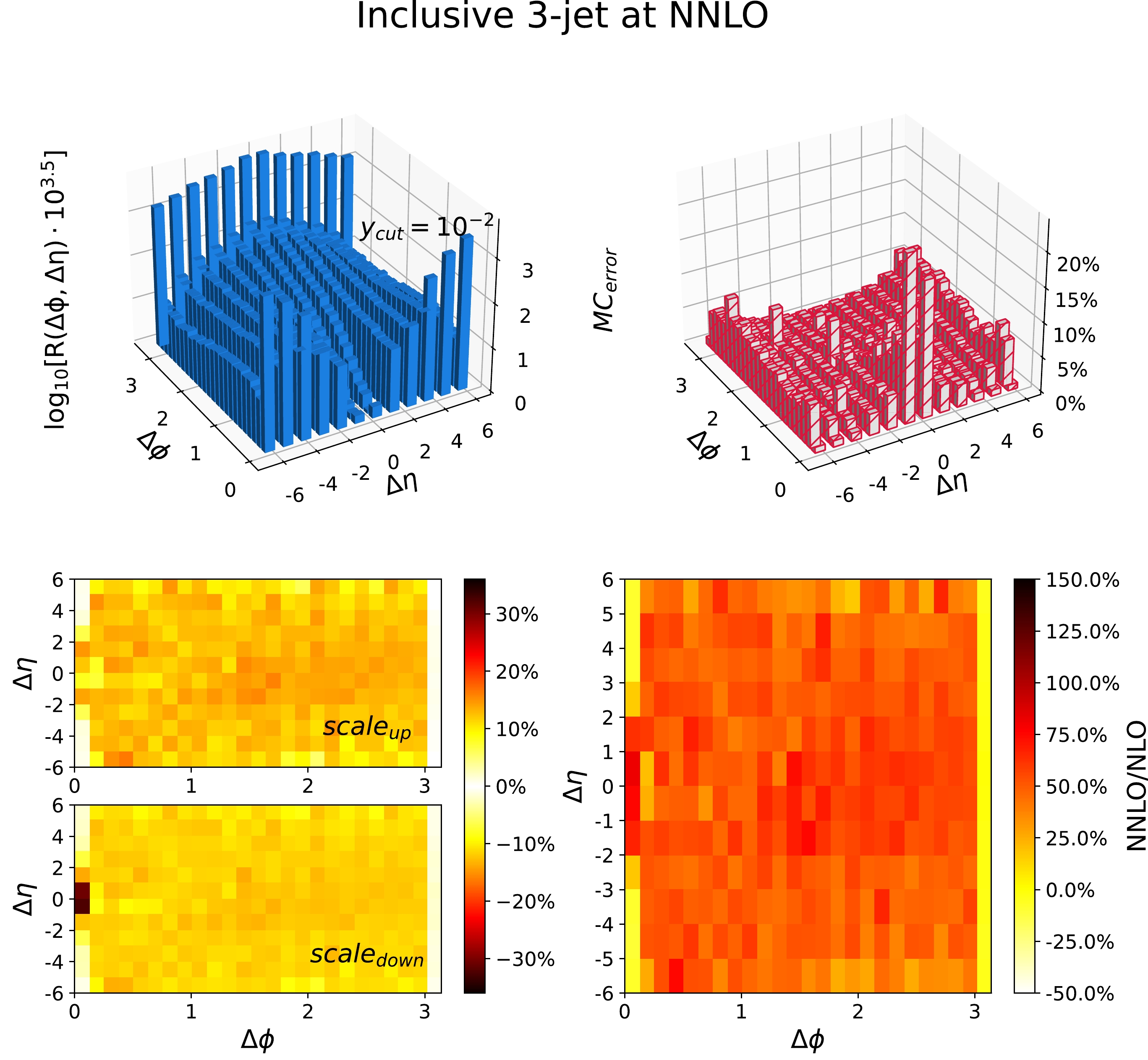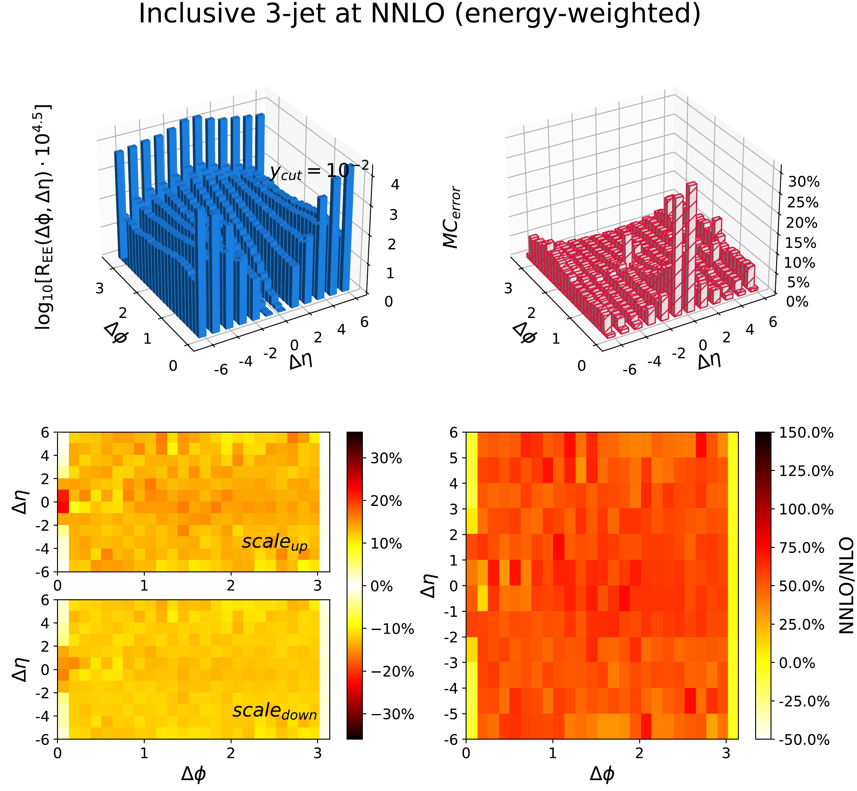 $ y_{\text{cut}} = 10^{-2} $ . The upper left panel shows the result at the central scale choice; the upper right panel shows the relative statistical error; the lower left panel illustrates the systematic error due to the scale variation, as given by Eq. (10), where$ \text{scale}_{\text{up}} $ ($ \text{scale}_{\text{down}} $ ) is the largest positive (negative) correction relative to the central scale; and the lower right panel displays the relative correction of the NNLO results with respect to the NLO results at the central scale.