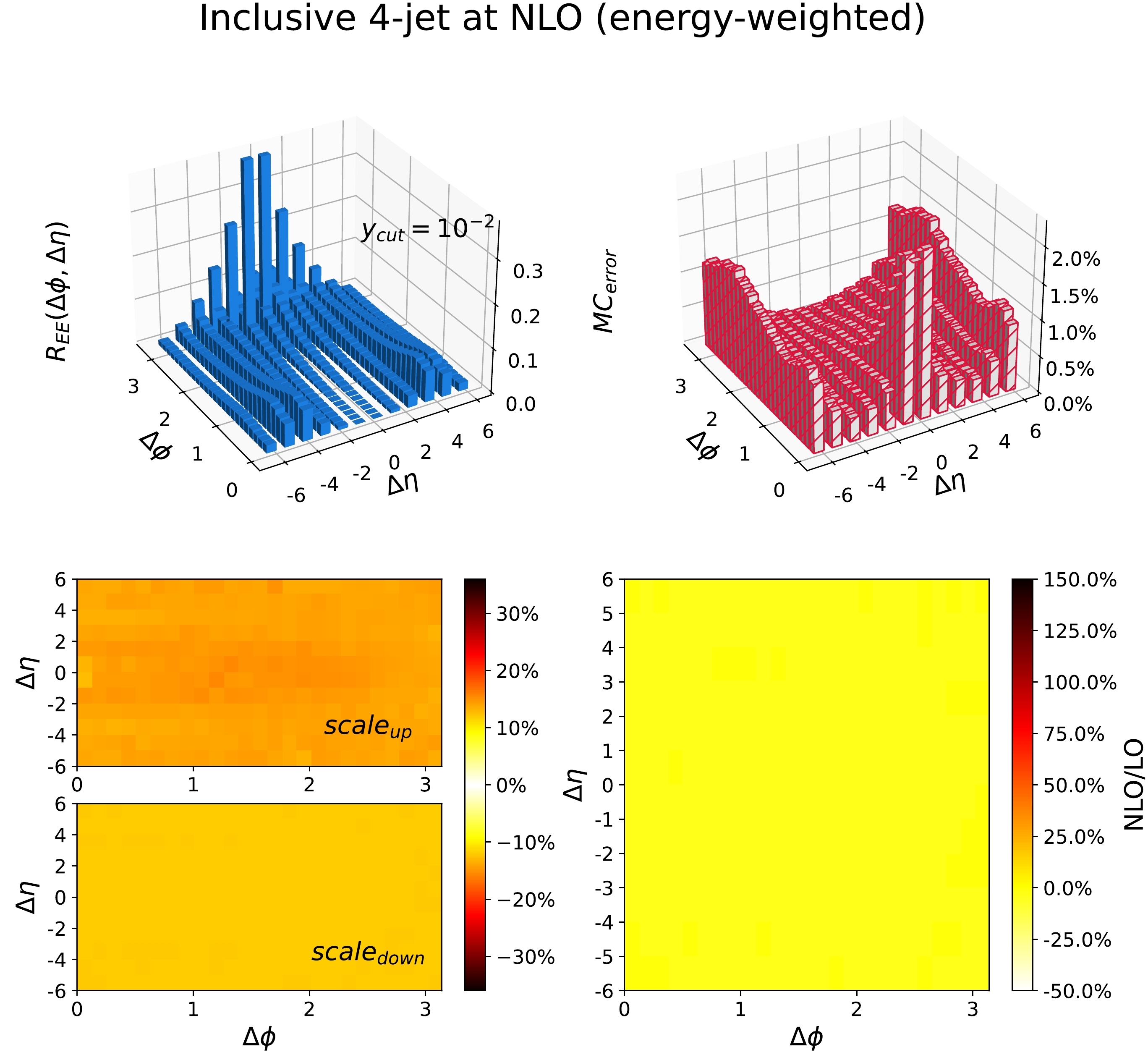$ \dfrac{4E_{i}E_{j}}{s} $ ($ R_{EE} $ ) in the inclusive 4-jet events at NLO with$ y_{\text{cut}} = 10^{-2} $ . The upper left panel shows the result at the central scale choice; the upper right panel shows the relative statistical error; the lower left panel illustrates the systematic error due to the scale variation, as given by Eq. (10), where$ \text{scale}_{\text{up}} $ ($ \text{scale}_{\text{down}} $ ) is the largest positive (negative) correction relative to the central scale; the lower right panel displays the relative correction of the NLO results to the LO results at the central scale. -