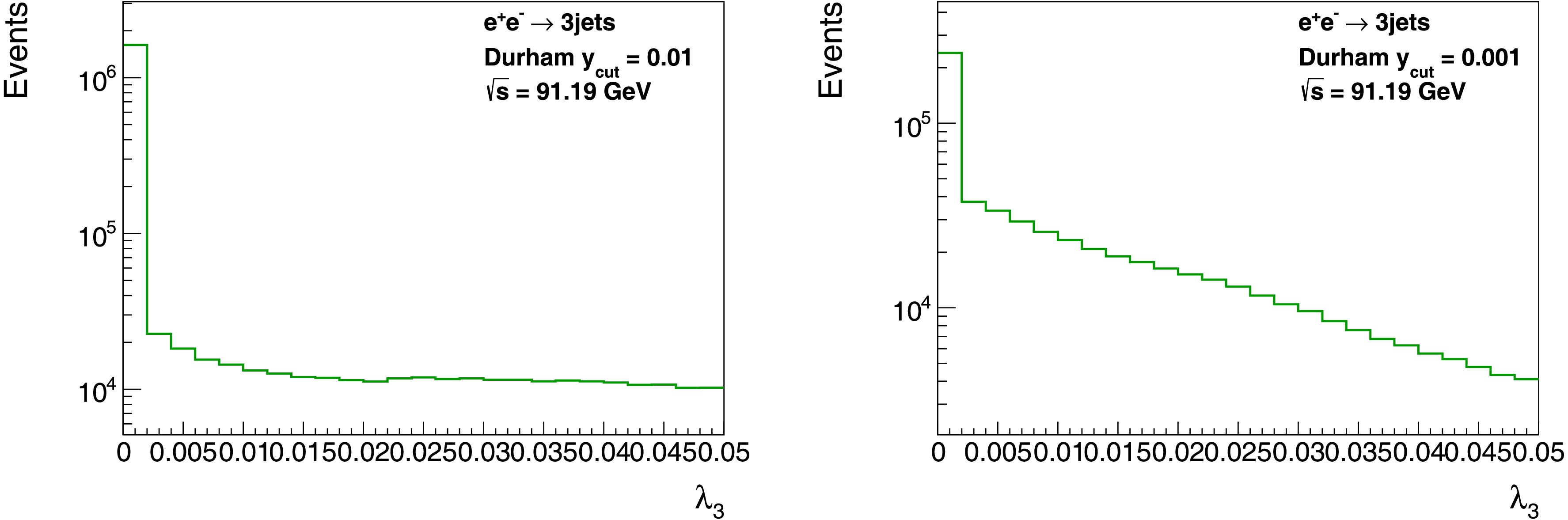 $ \lambda_3 $ in the inclusive 3-jet events at the center-of-mass energy$ \sqrt{s}=m_Z $ for$ y_{\text{cut}} = 10^{-2} $ (left panel) and$ 10^{-3} $ (right panel), based on PYTHIA 8.3 [96].
