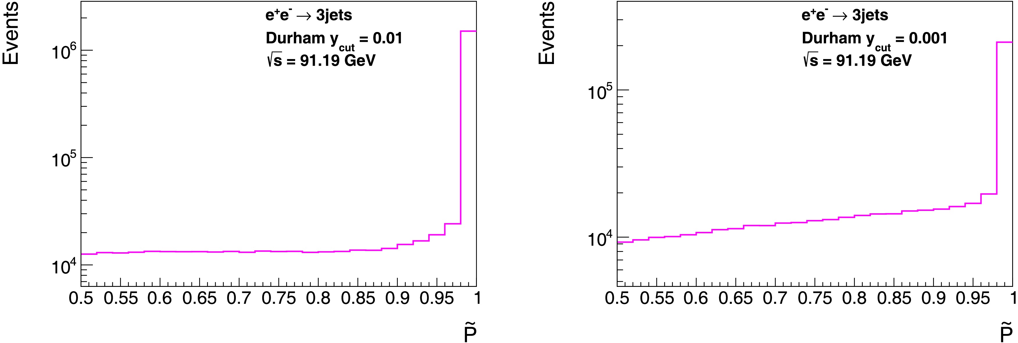 $ \tilde{P} $ in the inclusive 3-jet events at the center-of-mass energy$ \sqrt{s}=m_Z $ for$ y_{\text{cut}} = 10^{-2} $ (left panel) and$ 10^{-3} $ (right panel), based on PYTHIA 8.3 [96].