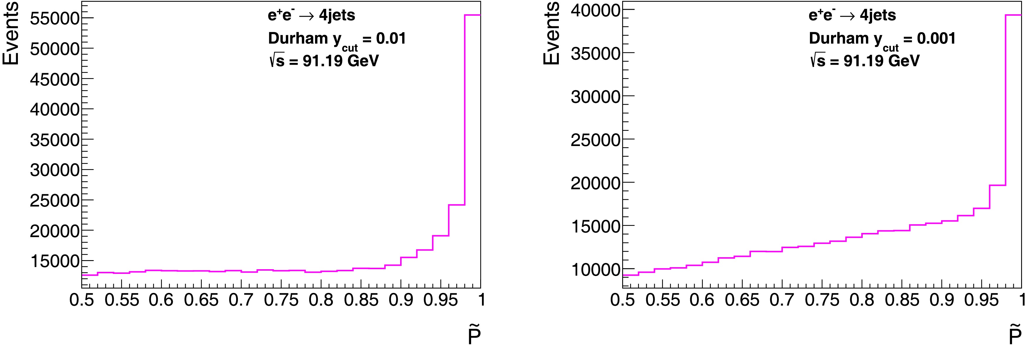 $ \tilde{P} $ in the inclusive 4-jet events at the center-of-mass energy$ \sqrt{s}=m_Z $ for$ y_{\text{cut}} = 10^{-2} $ (left panel) and$ 10^{-3} $ (right panel), based on PYTHIA 8.3 [96].