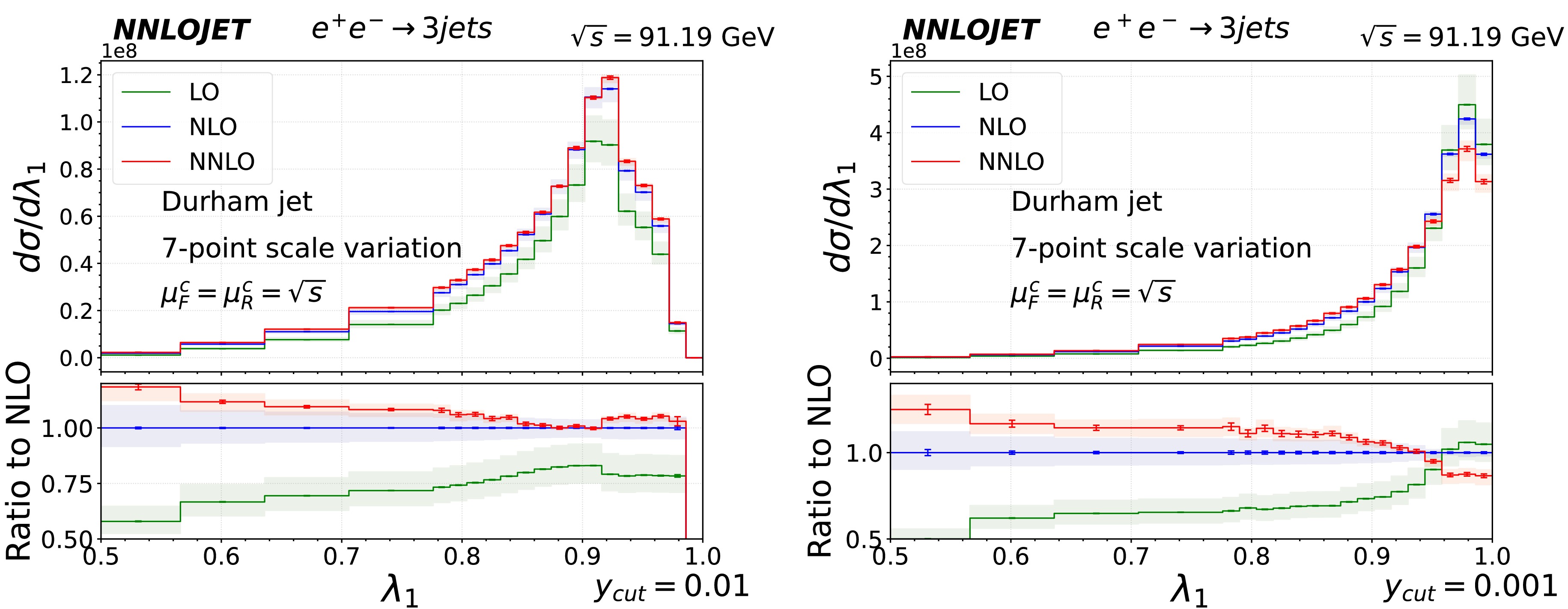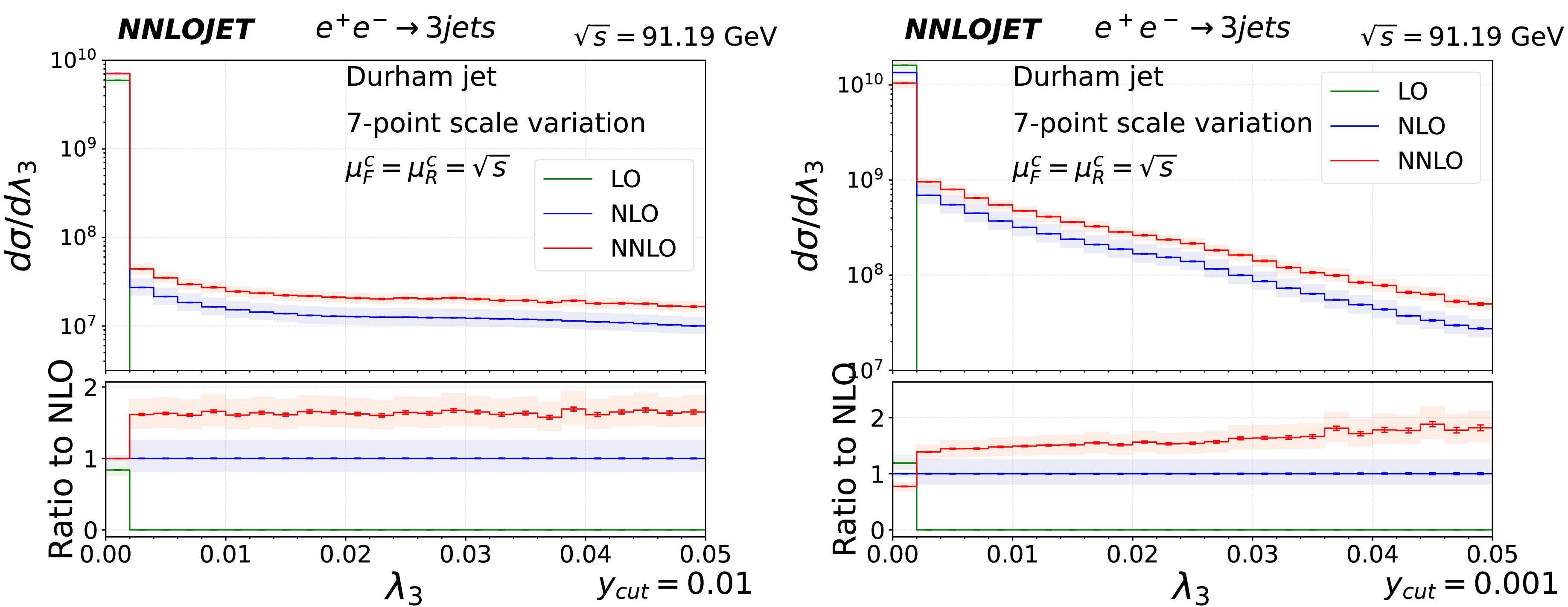 $ \lambda_3 $ in inclusive 3-jet events at center-of-mass energy$ \sqrt{s}=m_Z $ for$ y_{\text{cut}} = 10^{-2} $ (left panel) and$ 10^{-3} $ (right panel). The upper panels present predictions at LO (in green), NLO (in blue), and NNLO (in red). The lower panels display the ratios of NNLO, NLO, and LO over NLO predictions. Statistical errors are represented by error bars, while light-shaded bands indicate systematic uncertainties arising from scale variations according to equation (10).The