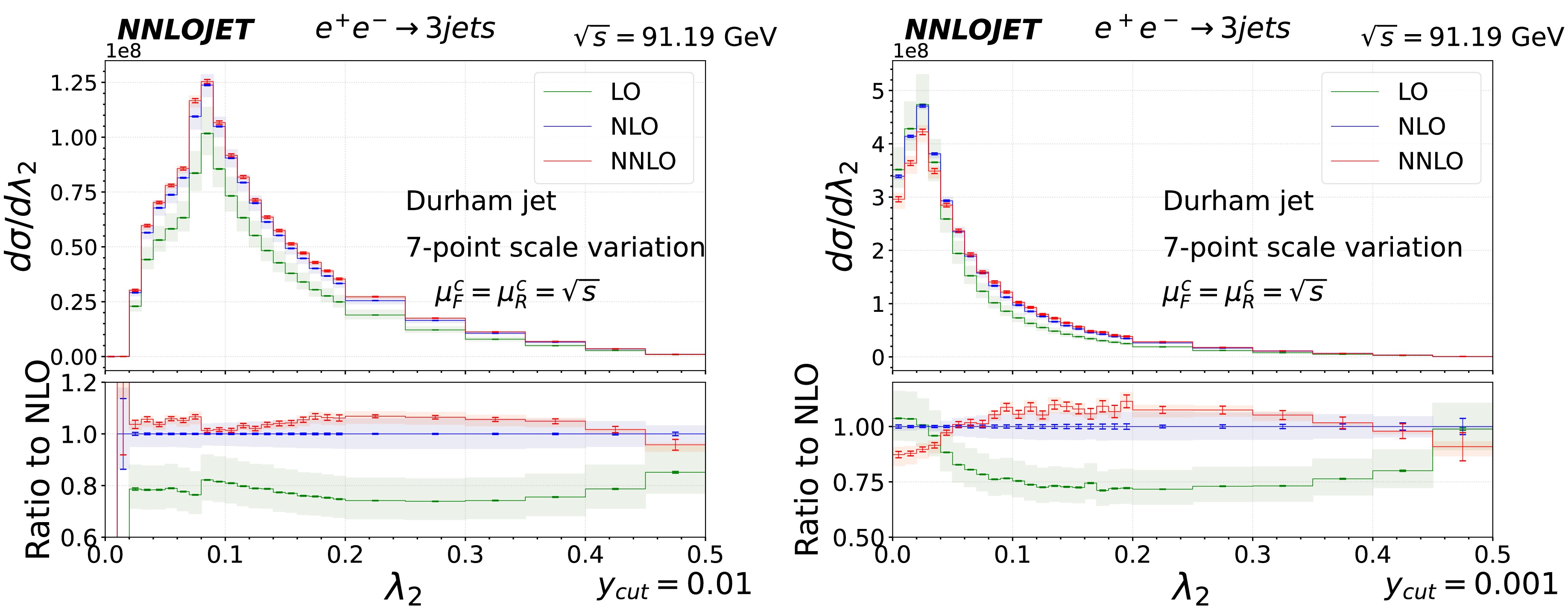 $ \lambda_2 $ in the inclusive 3-jet events at the center-of-mass energy$ \sqrt{s}=m_Z $ for$ y_{\text{cut}} = 10^{-2} $ (left panel) and$ 10^{-3} $ (right panel). The upper panels present the predictions at LO (in green), NLO (blue), and NNLO (red). The lower panels display the ratios of the NLO and LO predictions over the NLO predictions. The statistical errors are represented by the error bars, whereas the light-shaded bands indicate the systematic uncertainties arising from the scale variations according to equation (10).Both figures show no shift in the peak position with higher order pQCD corrections, which, however, change the shape and theory uncertainty of the distributions. The peak of the