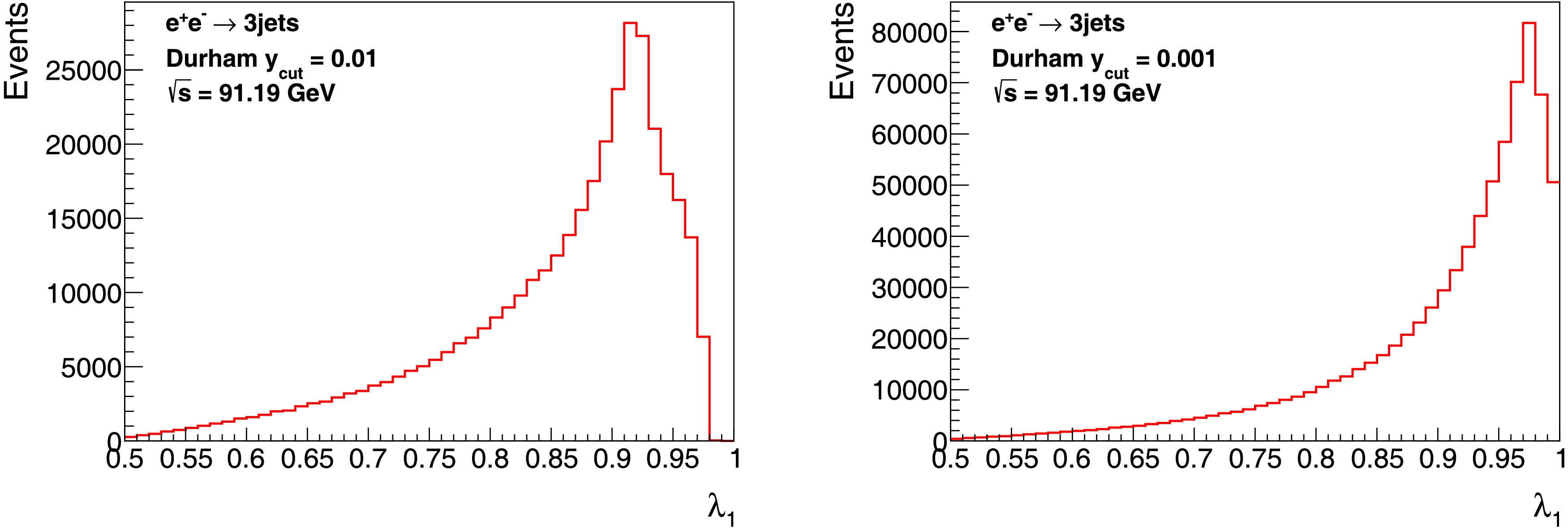 $ \lambda_1 $ in the inclusive 3-jet events at the center-of-mass energy$ \sqrt{s}=m_Z $ for$ y_{\text{cut}} = 10^{-2} $ (left panel) and$ 10^{-3} $ (right panel), based on PYTHIA 8.3 [96].