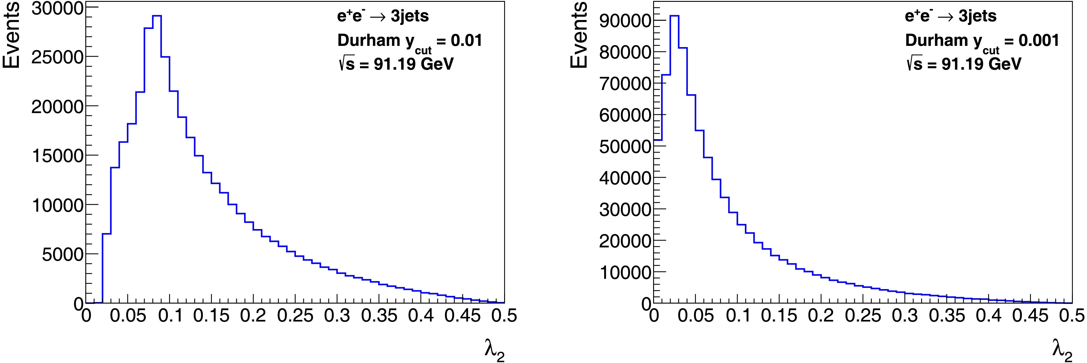 $ \lambda_2 $ in the inclusive 3-jet events at the center-of-mass energy$ \sqrt{s}=m_Z $ for$ y_{\text{cut}} = 10^{-2} $ (left panel) and$ 10^{-3} $ (right panel), based on PYTHIA 8.3 [96].Figure 6 shows the differential distribution of