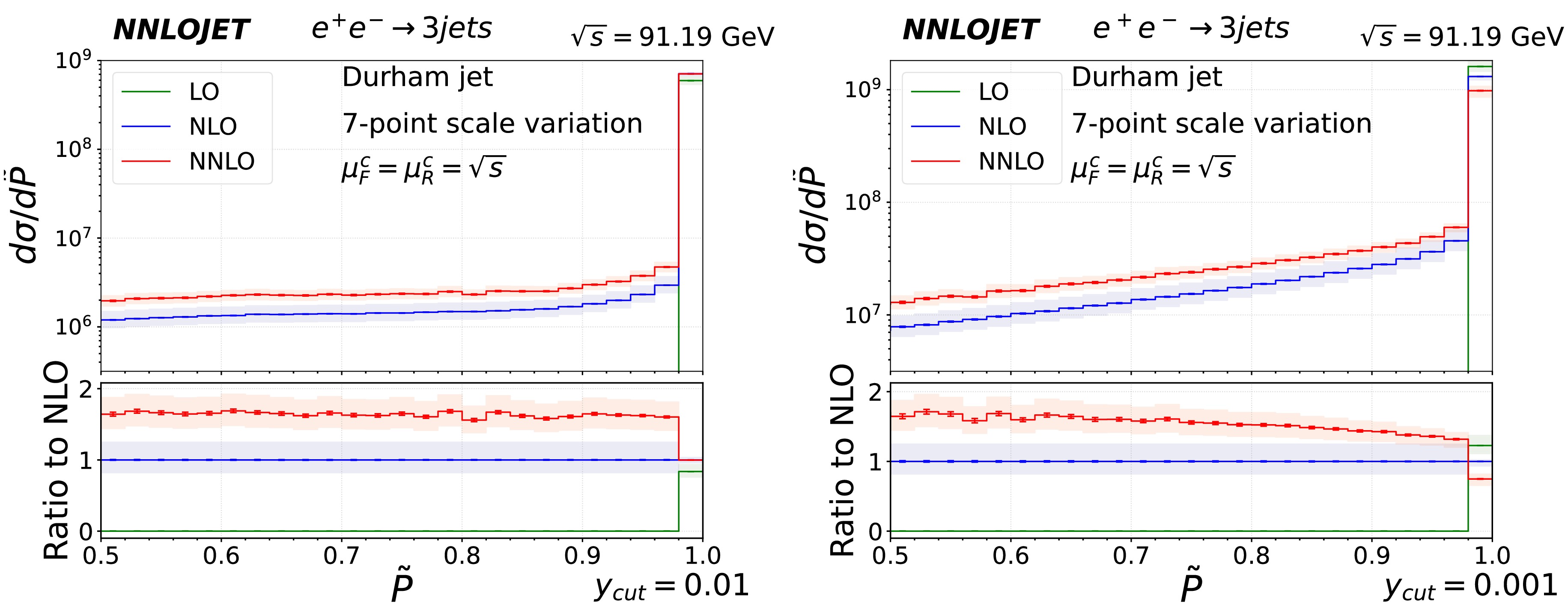 $ \tilde{P} $ in inclusive 3-jet events at center-of-mass energy$ \sqrt{s}=m_Z $ for$ y_{\text{cut}} = 10^{-2} $ (left panel) and$ 10^{-3} $ (right panel). The upper panels present predictions at LO (green), NLO (blue), and NNLO (red). The lower panels display the ratios of the NNLO, NLO, and LO over NLO predictions. Statistical errors are represented by error bars, whereas light-shaded bands indicate systematic uncertainties arising from scale variations according to equation (10).In the above analysis of the inclusive 3-jet events, we note that exclusive 3-jet events are fully planar. Therefore, we present the