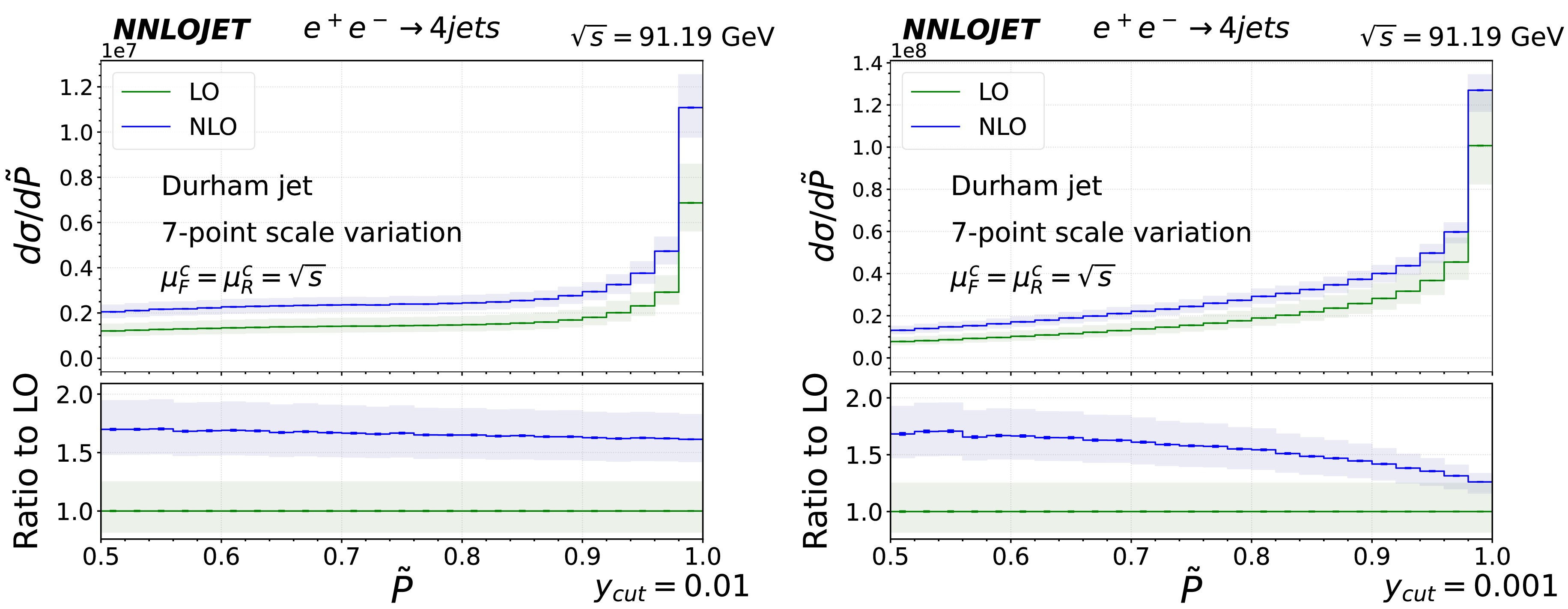 $ \tilde{P} $ in the inclusive 4-jet events at the center-of-mass energy$ \sqrt{s}=m_Z $ for$ y_{\text{cut}} = 10^{-2} $ (left panel) and$ 10^{-3} $ (right panel). The upper panels present the predictions LO (green) and NLO (blue). The lower panels display the ratios of the NLO and LO predictions over the LO predictions. The statistical errors are represented by the error bars, whereas the light-shaded bands indicate the systematic uncertainties arising from the scale variations according to equation (10).The analysis of the above observables adequately demonstrates the planarity of the events driven by pQCD, including those with a higher multiplicity of jets. When more than three jets exist, generally, the momenta are not restricted in a plane, but the whole phase space of an event is still significantly planar. Because the higher order corrections are relatively small and have less uncertainty of scale variation in the entire region for large