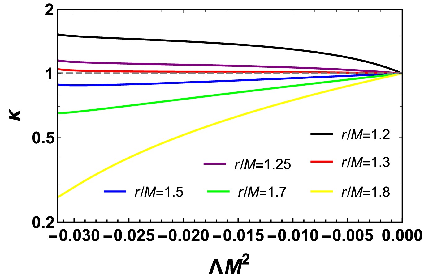 (12) Solving the above equation could yield the corotating orbital radius of the photon around the black hole, which we demonstrate to depend functionally on the mass M, spin a, and cosmological constant Λ. Because the analytical expression is more complex, we employ numerical methods to investigate the orbit characteristics.