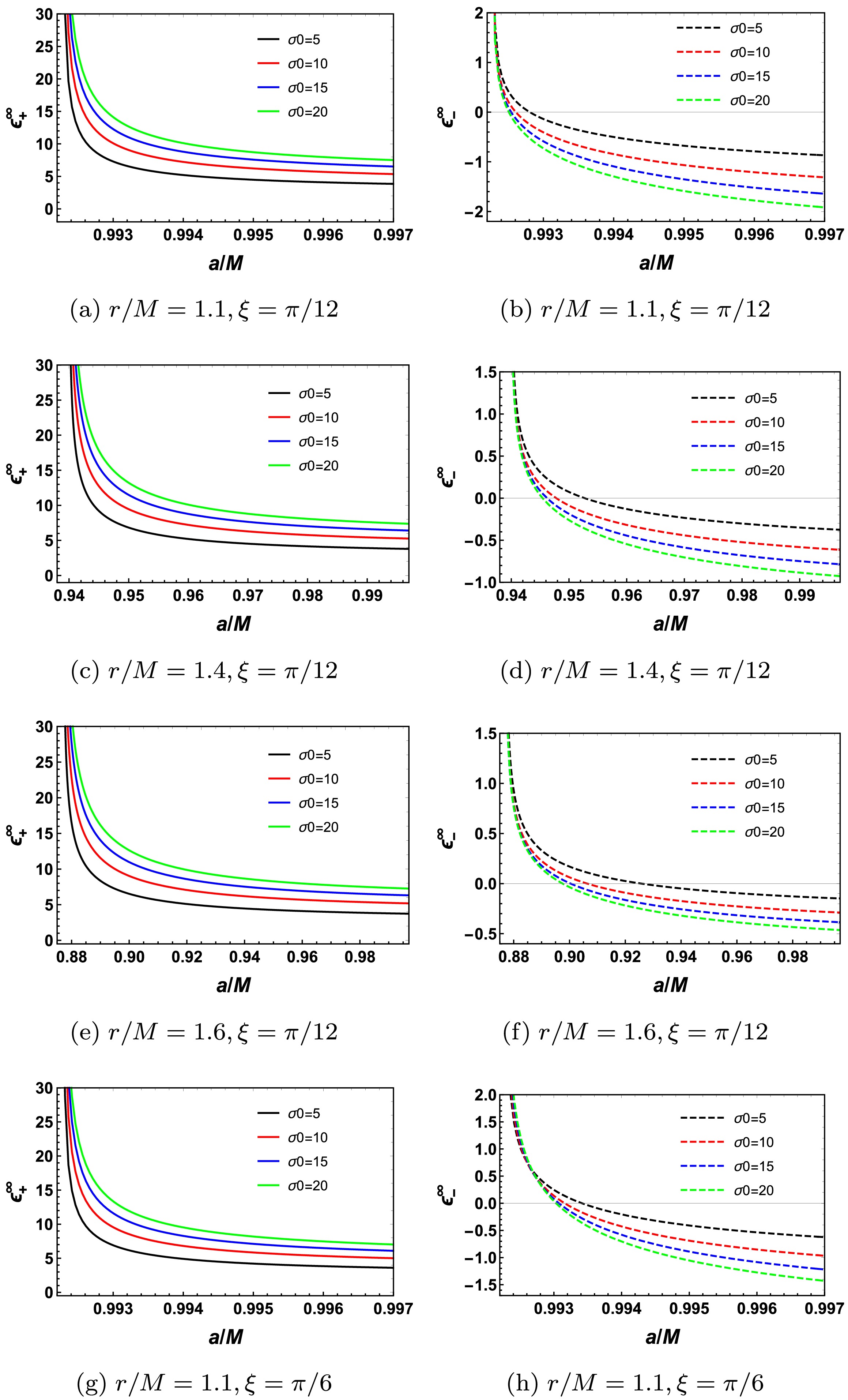 $ \epsilon^\infty_+ $ (solid curves) and$ \epsilon^\infty_- $ (dashed curves) as functions of spin$ a/M $ for different values of the plasma magnetization$ \sigma_0 $ , orientation angle ξ, and dominant reconnection radial location$ r/M $ and with cosmological constant$ \Lambda M^2=-0.01 $ fixed. The plasma magnetization$ \sigma_0 $ = 5, 10, 15, and 20 goes from bottom to top for solid curves and from top to bottom for dashed curves.